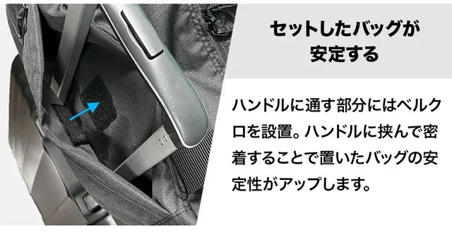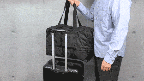 スーツケースにセットして固定できるキャリーオン機能を搭載。ポケット部分をハンドルに通してバッグを固定できます。荷物をまとめて移動できるので便利です。