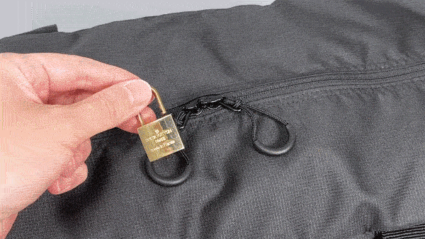 メイン収納のファスナーには鍵穴付きのロックファスナーを搭載。南京錠などを付ければ旅行先で防犯対策になります。※鍵と錠は付属していません。
