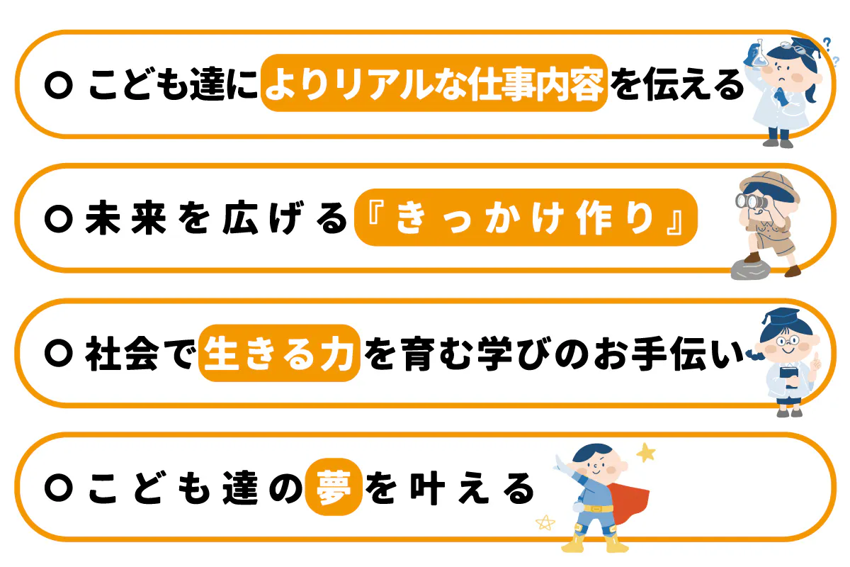 など、たくさんのお声をいただいています。ただ、今まで通りであれば限られた人にしか仕事の内容を紹介できないので、今回は”本格的な仕事体験を提供する企業”に監修を頼み、よりグレードアップした体験内容を伝えたいと思います。また、地域に根差す企業様とも力を合わせ、地域貢献の一環として、こども達に将来を考える”きっかけ作り”の場を提供したいと思っています。