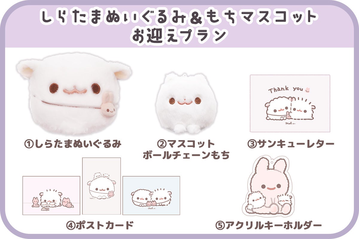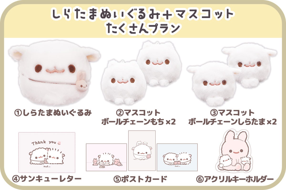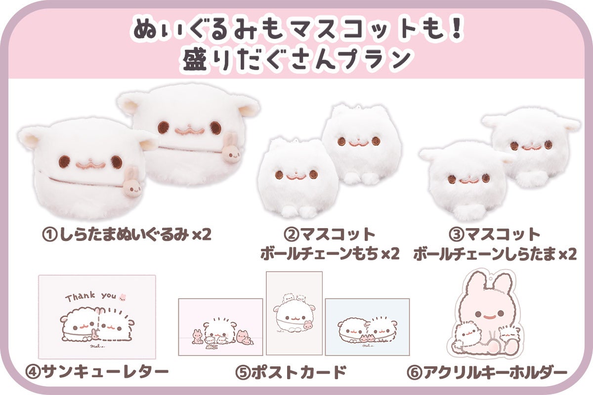 しらたまぬいぐるみ2体、もちマスコット2体、しらたまマスコット2体の豪華プラン