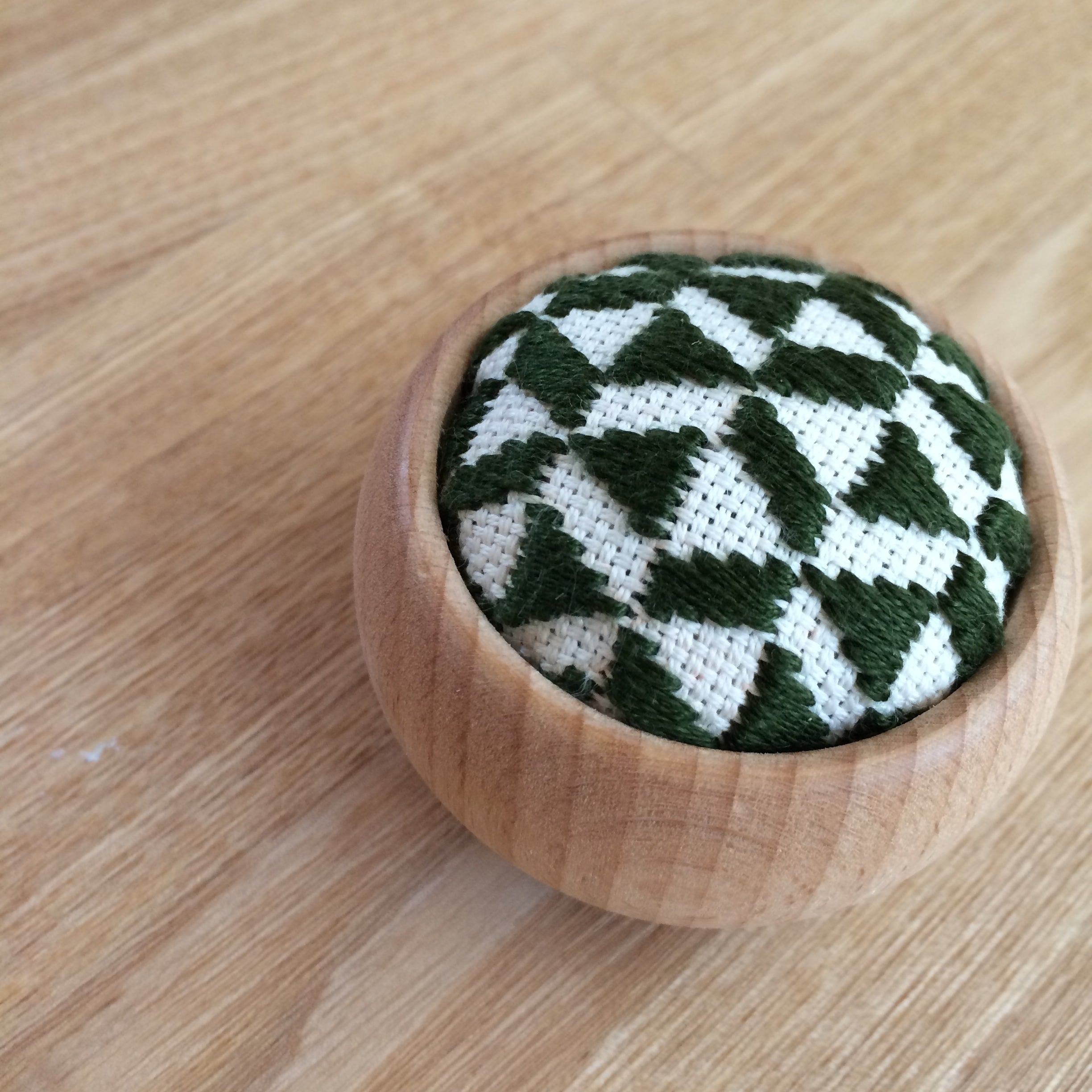 そして、手芸をするのに、道具としてかわいいピンクッションが欲しくて当時まだ始めたばかりのInstagramで検索して見つけたものそれが、こぎん刺しのピンクッションでした。作家さんが販売していた作品を購入しようとしたところ、その方が自分で作ることができるキットとして材料を販売していたため『これは自分好みのものを作ってみたい!』と購入したことが、最初のこぎん刺し作品を作ったきっかけです。当時はそれが伝統工芸の技法だということも全く知らず、ただ可愛いと心躍ったことを覚えています。