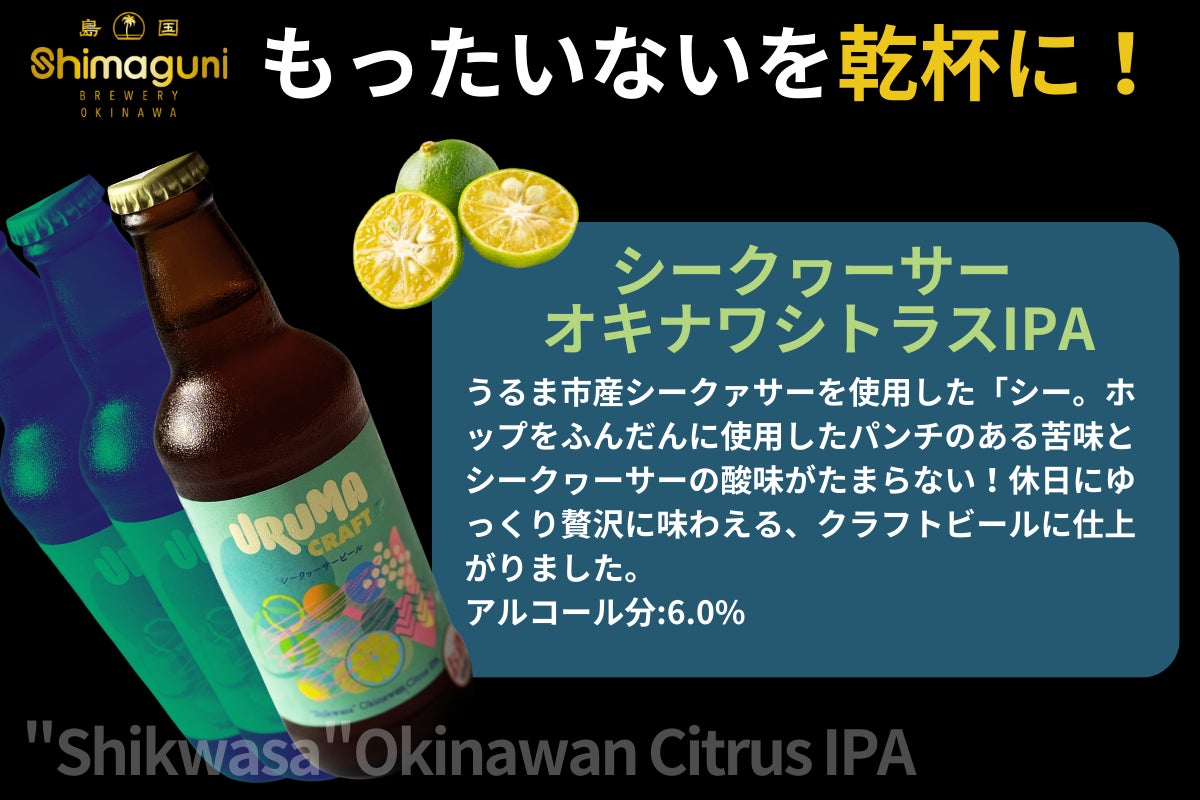 うるま市産シークァーサーを使用した「シークァーサー オキナワシトラスIPA」。ホップをふんだんに使用したパンチのある苦味とシークヮサーの酸味がたまらない!休日にゆっくり贅沢に味わえる、クラフトビールに仕上がりました。アルコール分:6.0%