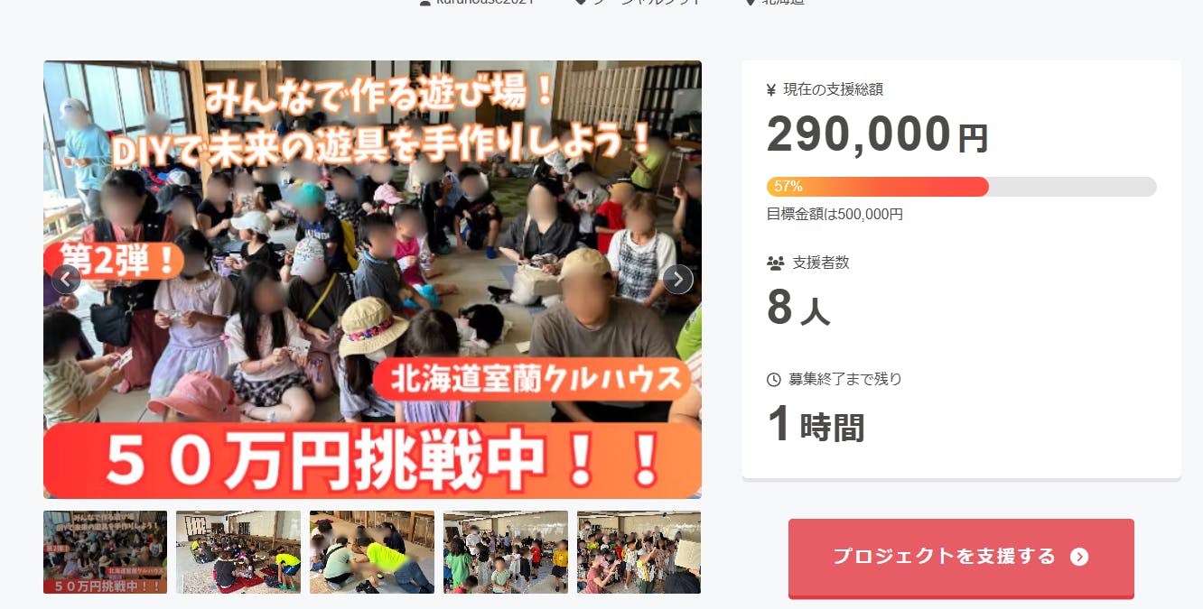 2024/12/31 22:26皆様、いつも暖かいご支援をいただき、本当にありがとうございます!現在、私たちの 「みんなで作る遊び場!DIYで未来の遊具を手作りしよう!」 プロジェクトが大詰めを迎えています。目標金額 500,000円 に対し、現時点で 290,000円(57%) のご支援を頂いております。ですが、残り 1時間 で目標達成に到達しなければなりません!このプロジェクトの意義新型コロナの影響や地域での孤立感が増える中、子どもたちが安心して遊べる場所、笑顔で過ごせる居場所が必要とされています。そこで、私たちはDIYを活用し、地域住民や支援者の皆様と一緒に「未来の遊具」を手作りするプロジェクトを立ち上げました。遊具設置だけでなく、子どもたちの成長、自信、そして地域のつながりを育むこと を目指しています。目標達成まであと一歩!皆様の力が必要です支援してくださった皆様には、感謝の気持ちを込めたお礼状 や、プロジェクト完了後の完成お披露目イベントへの招待 などをご用意しております。今ならまだ間に合います!この1時間が未来を変える力となります。お一人お一人の応援が、子どもたちの笑顔につながります。支援方法以下のリンクから、簡単にご支援いただけますhttps://camp-fire.jp/projects/797816/最後にこのプロジェクトは、未来の子どもたちのための挑戦です。「もう少し遊べる場所があったらいいのに」「子どもたちの笑顔を守りたい」そんな思いを共に叶えていただけませんか?どうか、最後の1時間、皆様の温かいご支援をよろしくお願い申し上げます。感謝のメッセージこれまでにいただいたご支援、心より感謝申し上げます。皆様の応援が、私たちの活動を支え、未来をつくる力となっています。引き続きのご理解とご協力をお願い申し上げます。 もっと見る