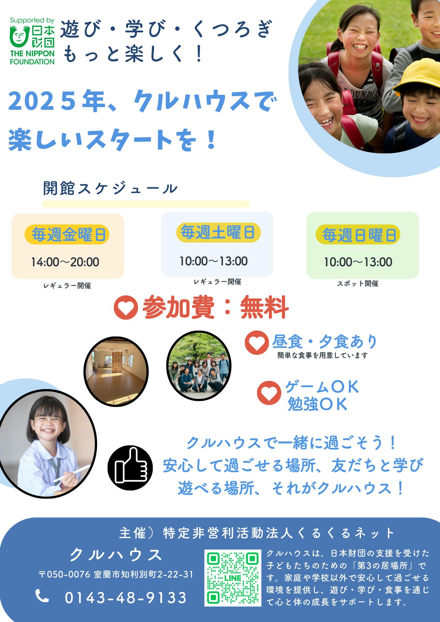 2024/12/31 22:38特定非営利活動法人くるくるネットが運営する「クルハウス」では、2025年も楽しい時間を一緒に過ごす準備が整っています!私たちの目標は、地域の子どもたちに「安心して過ごせる場所」と「友だちと学び、遊ぶ場」を提供することです。クルハウスの魅力ポイント遊び・学び・くつろぎが楽しめる!クルハウスは、子どもたちがリラックスしながら学べる、そして友だちと楽しく過ごせる環境を提供します。ゲームや勉強もOKなので、それぞれのスタイルに合わせて自由に時間を過ごせます。昼食・夕食あり!お腹が空いても安心!簡単な食事を準備していますので、楽しい時間をしっかりサポートします。参加費無料!誰でも気軽に参加できるよう、費用は一切かかりません。みんなで楽しい時間を共有しましょう!開館スケジュール毎週金曜日:14:00~20:00(レギュラー開催)毎週土曜日:10:00~13:00(レギュラー開催)毎週日曜日:10:00~13:00(スポット開催)※詳細はお気軽にお問い合わせください!クルハウスとは?「クルハウス」は、特定非営利活動法人くるくるネットが運営する子どもたちのための『第3の居場所』です。家庭や学校以外で安心して過ごせる環境を提供し、遊び・学び・食事を通じて心と体の成長をサポートします。お問い合わせ住所:〒050-0076 室蘭市知利別町2-22-31電話:0143-48-9133LINEでの連絡も可能!QRコードをスキャンしてください。 もっと見る