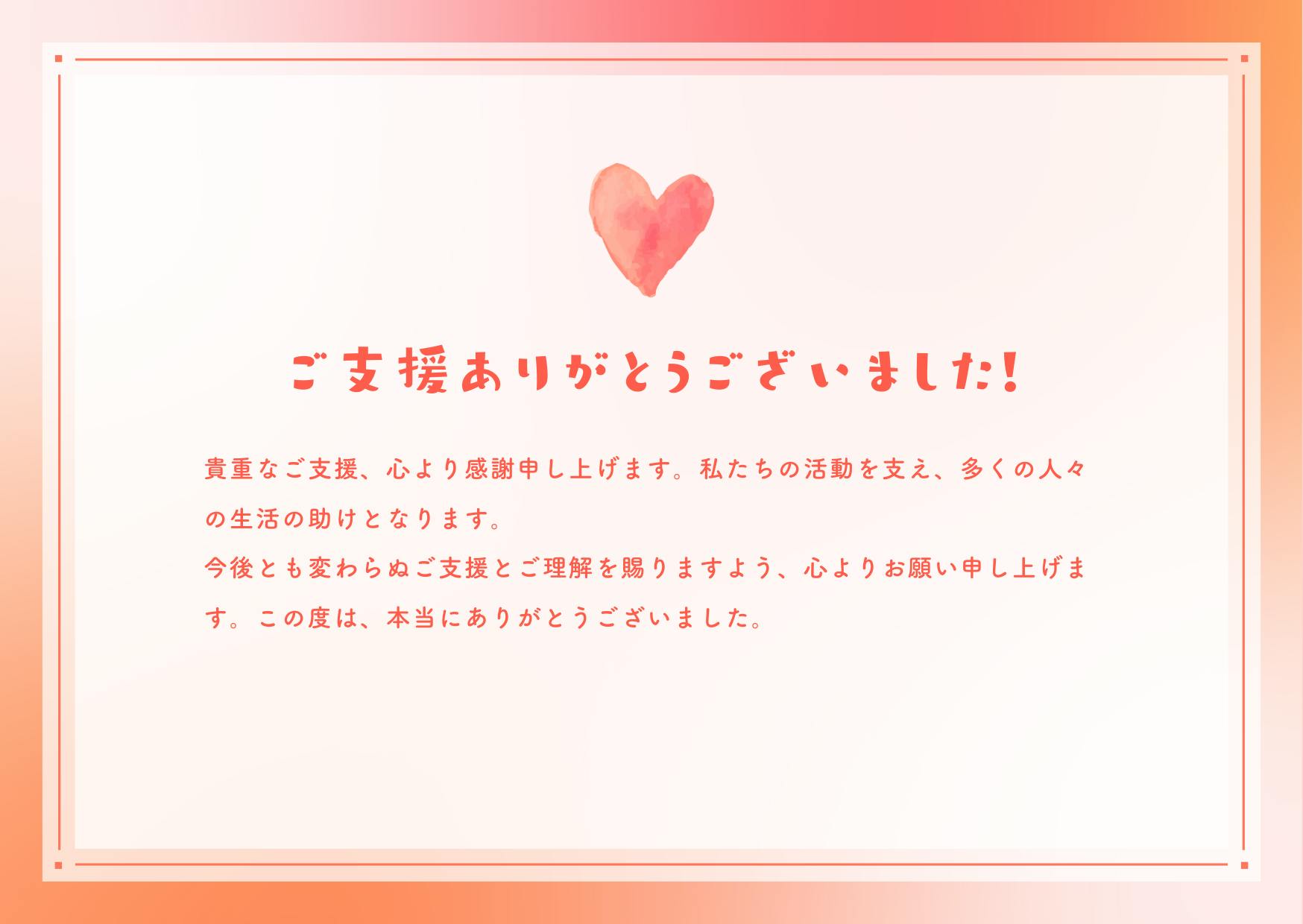 2025/01/01 00:00ご支援ありがとうございました!皆様、この度は私たちの活動への温かいご支援を誠にありがとうございました。皆様のご協力が、多くの方々の生活を支える大きな力となり、無事にプロジェクトを進めることができました。改めて心より感謝申し上げます。支援者の皆様へ感謝の想いこの感謝メッセージカードは、皆様への心からの感謝を込めたものです。私たちの活動は、皆様の支えがなければ成り立ちません。一つ一つのご支援が、地域の子どもたちにとって大切な居場所や笑顔を届ける原動力となっています。これからも変わらぬ応援をお願いいたします今後も引き続き、皆様と共に地域を支える活動を続けてまいります。私たちの目指す「安心できる居場所」や「遊びと学びの場」をより多くの子どもたちに届けるため、さらなる挑戦をしていきます。プロジェクトを振り返って今回のプロジェクトでは、多くの課題と向き合いながらも、皆様からの支援に支えられ、一歩ずつ前進することができました。特に、多くの方々からいただいた温かいメッセージや励ましの言葉は、私たちにとって大きな励みとなりました。最後にもう一度、心よりの感謝を「ご支援ありがとうございました!」この言葉に込められた私たちの想いが、皆様に伝わることを願っています。引き続きの応援を、どうぞよろしくお願いいたします。 もっと見る