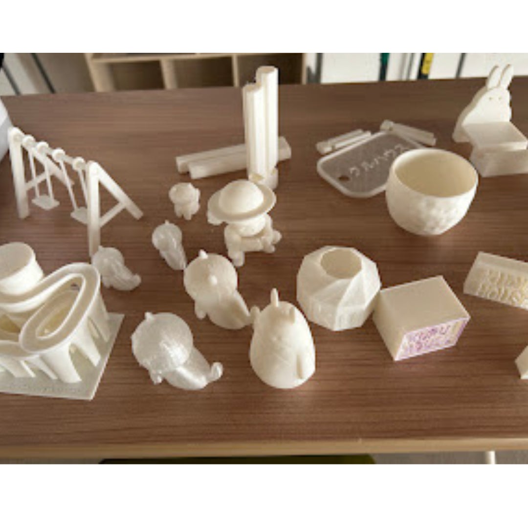 現在、クラウドファンディングの返礼品として3Dプリントで制作しているアイテムの試作品が続々と完成しています!写真にある通り、かわいいキャラクターやミニチュアのオブジェ、カップや飾り物など、多種多様なアイテムを用意しています。この3Dプリントアイテムは、皆様のご支援に感謝の気持ちを込めて、一つ一つ丁寧に作り上げています。