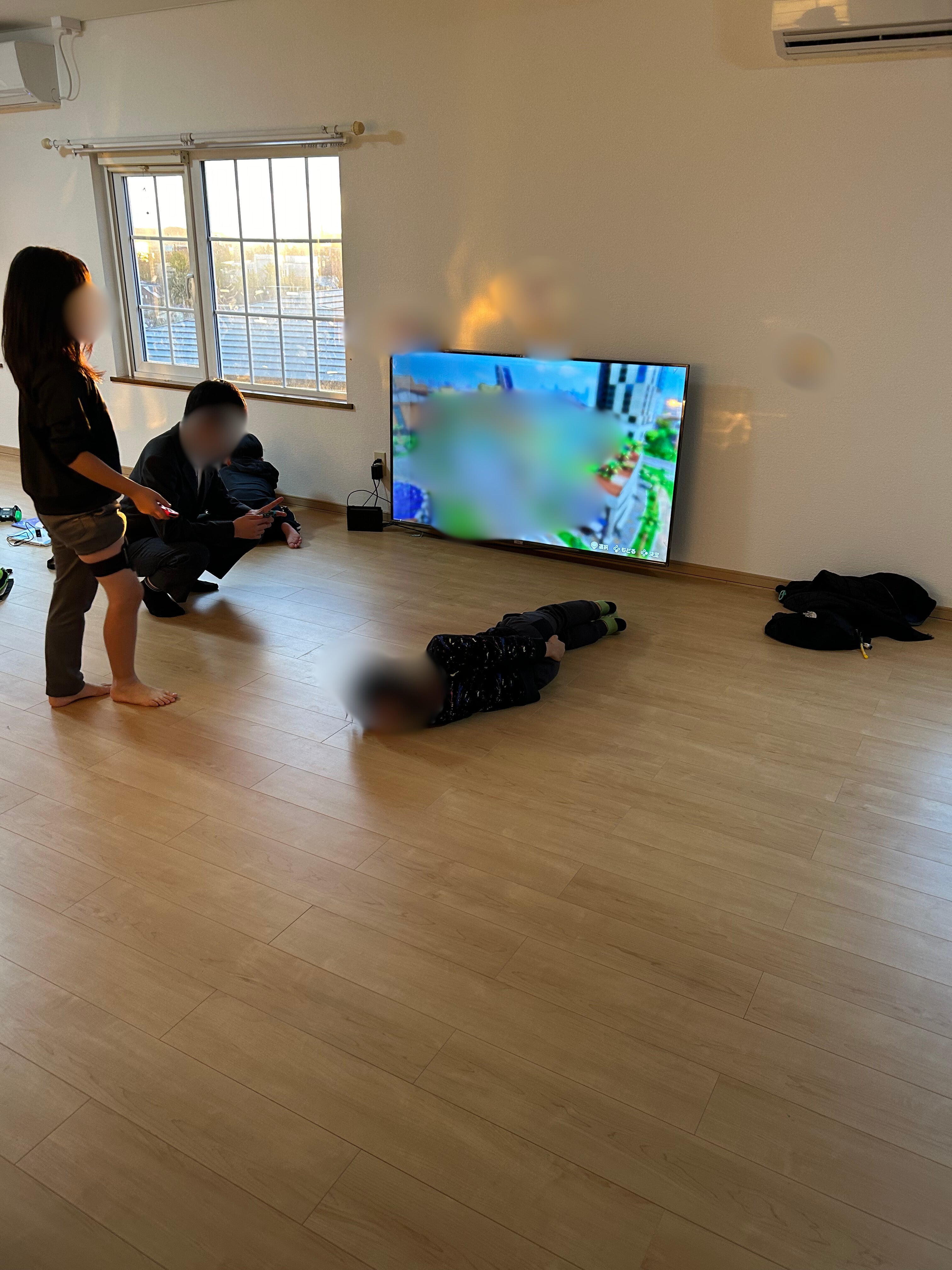 この日は子どもたちがNintendo Switchを使ってみんなで楽しく遊んでいました!広々としたスペースに設置された大きなテレビ画面の前で、座ったり寝転がったりしながら、リラックスしてゲームを楽しむ姿が見られました。