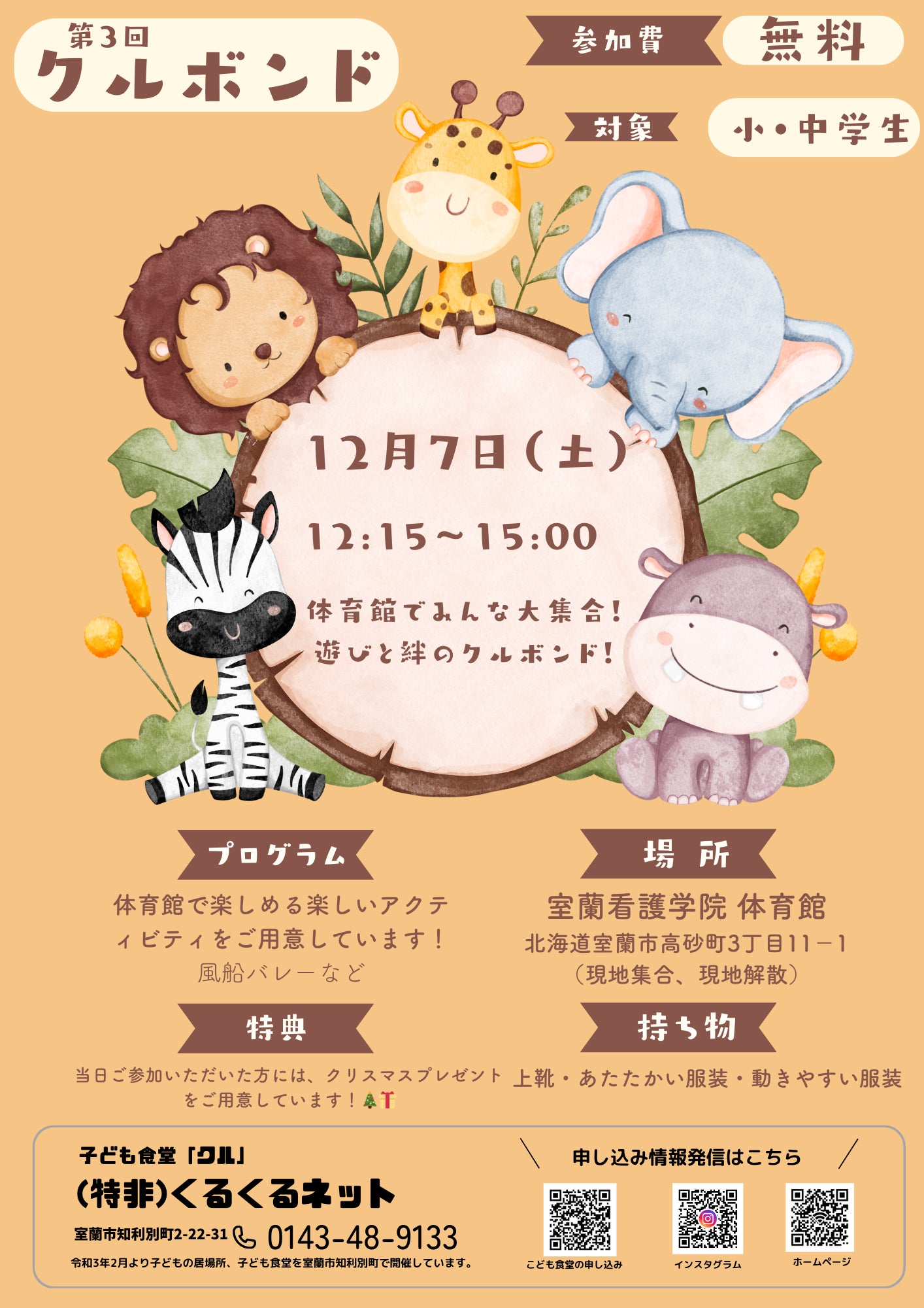 今年もやってきました「クルボンド」!遊びを通じてたくさんの子どもたちと絆を深められるイベントです。今回のテーマは「遊びと絆の大集合」。室蘭看護学院 体育館を会場に、みんなで楽しい時間を過ごしましょう!