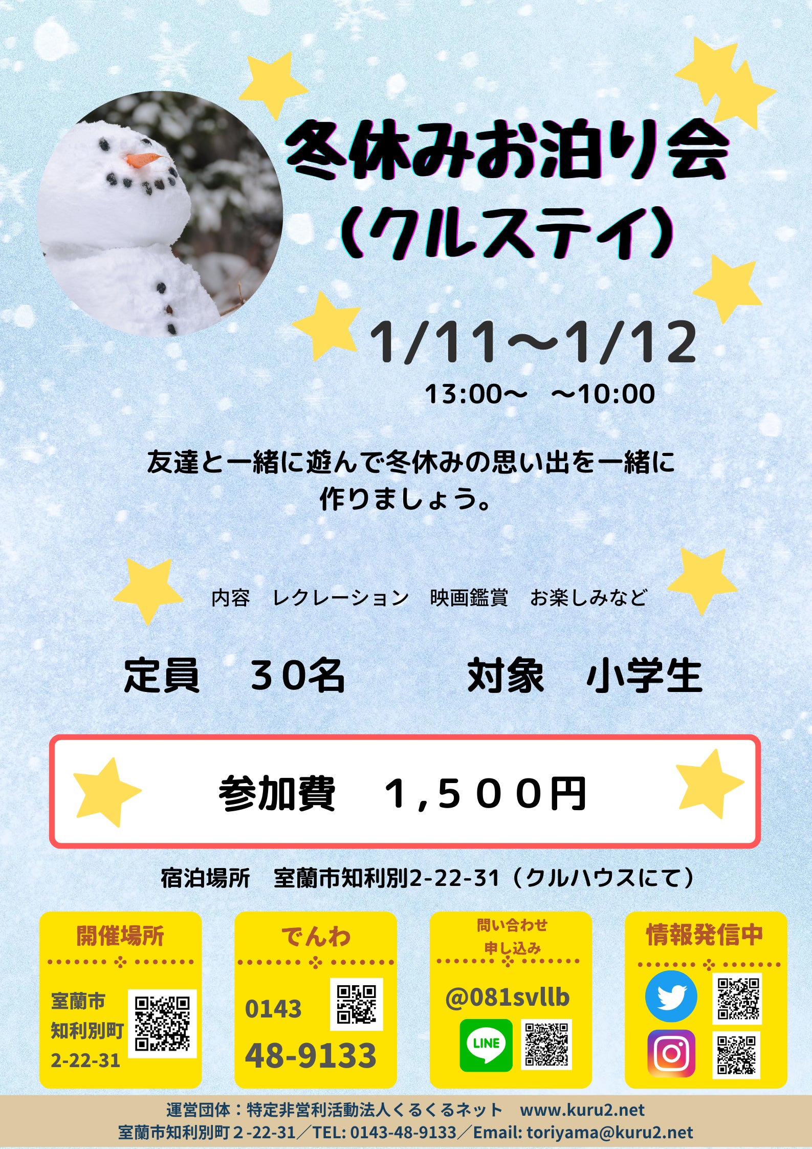 冬休みの思い出作りに、ぜひ「クルステイ」に参加してください!新しい友達と出会ったり、特別な体験ができる貴重な機会です