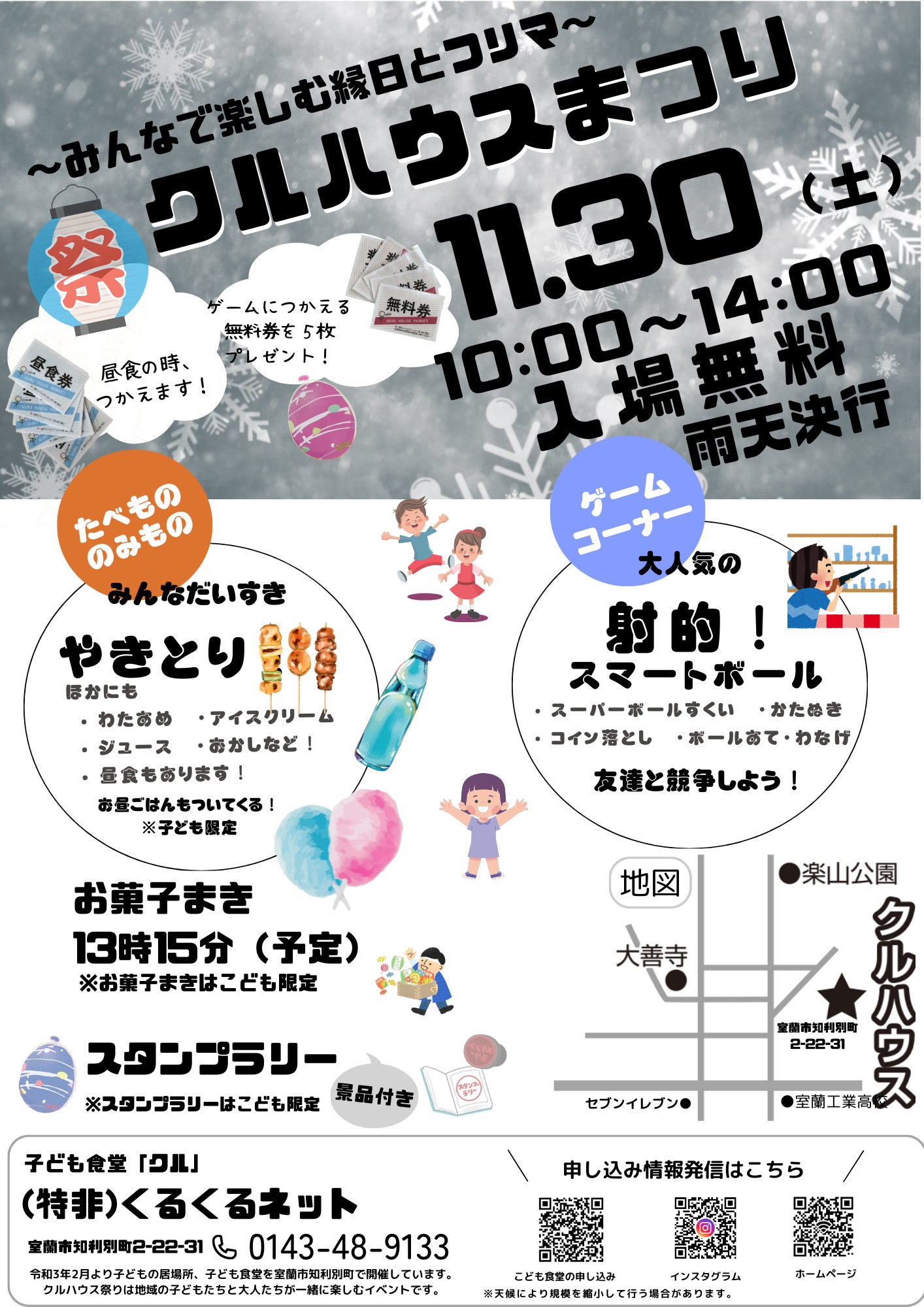 11月の終わりを家族や友達と楽しく過ごせる「クルハウスまつり」に、ぜひ遊びに来てください。スタッフ一同、みなさまのお越しを心よりお待ちしております。