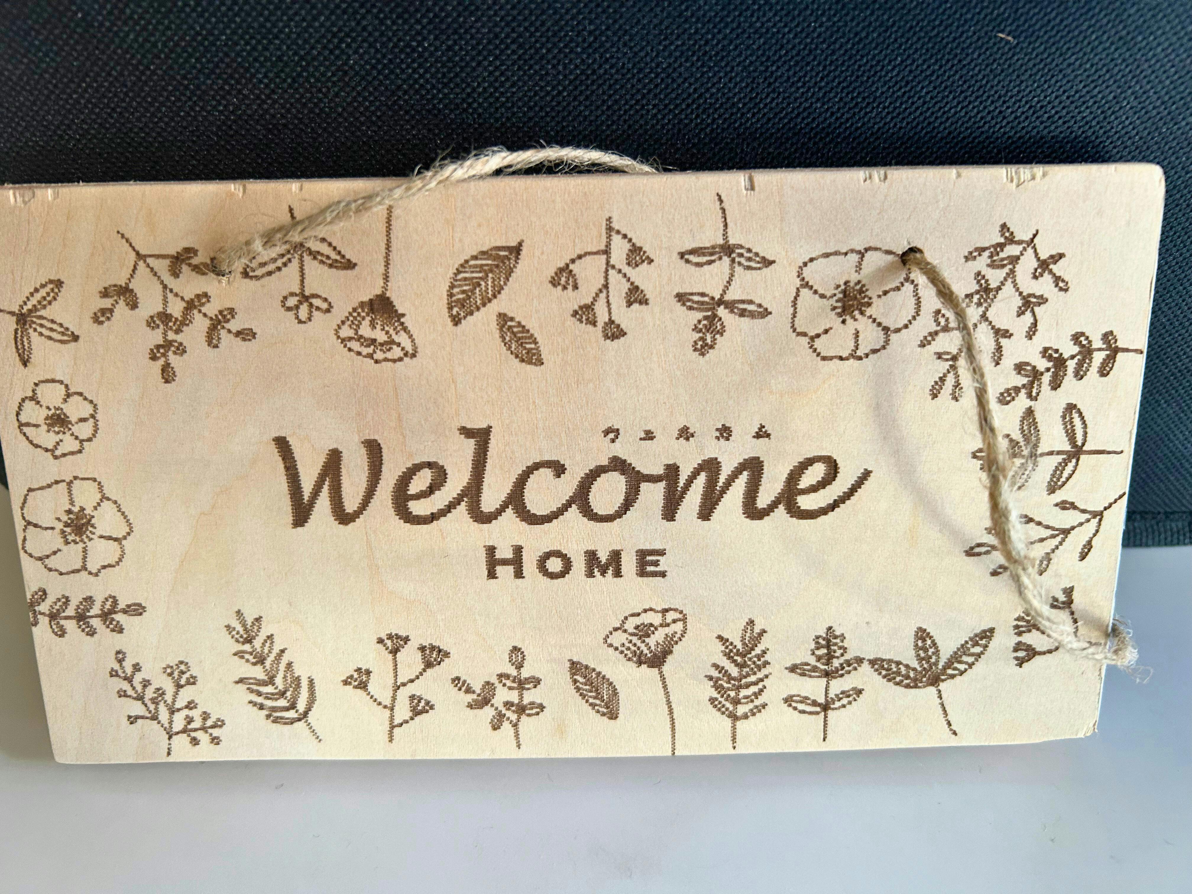 自然を感じるデザイン木の素材感を生かし、周囲には花や植物のモチーフがあしらわれています。「Welcome Home」のメッセージが、訪れる人を優しく迎え入れてくれる一枚です。