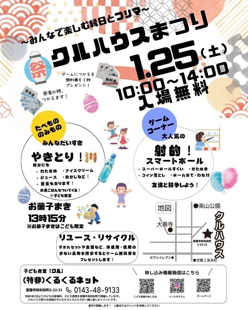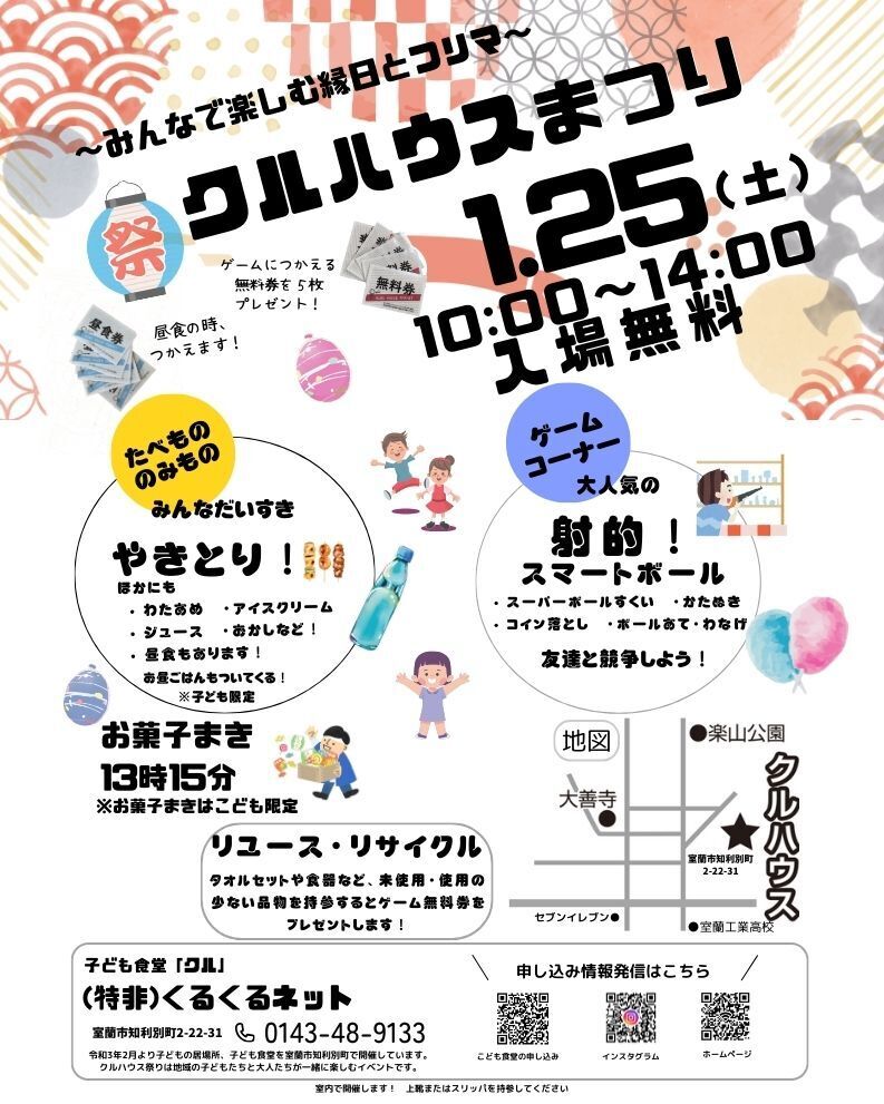 地域住民が交流し、子どもから大人まで楽しめる「クルハウスまつり」が1月25日(土)に開催されます。このイベントは、特定非営利活動法人くるくるネットが主催し、室蘭市知利別町の「クルハウス」で行われます。