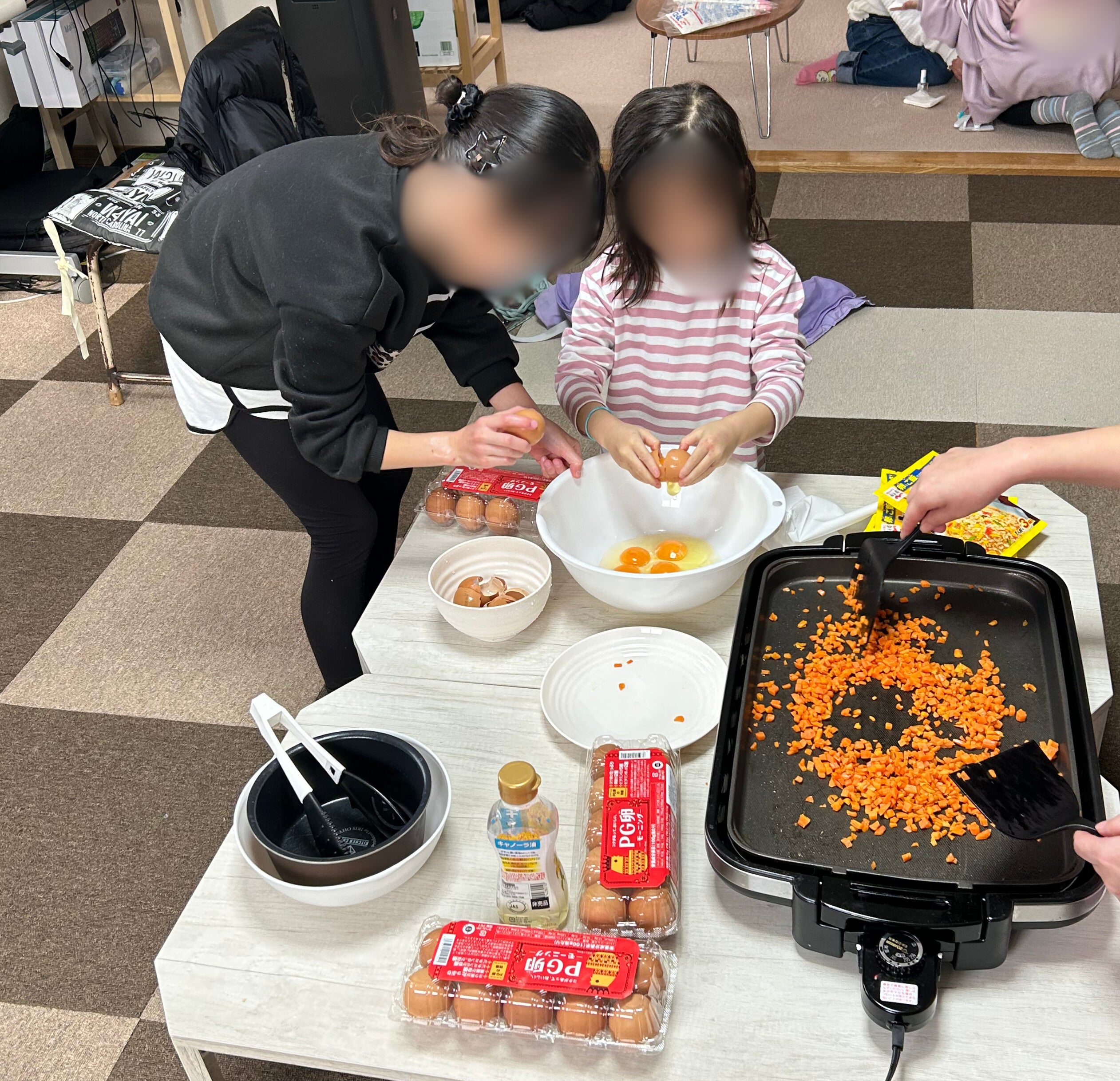 今回は子どもたちが主体となって調理を進めました。まずは卵を割るところからスタート。初めて卵を割る子もいれば、慣れた手つきの子もいて、それぞれが協力し合いながら作業していました。フライパンの中ではみじん切りした人参が彩りよく炒められ、香ばしい香りが広がりました。