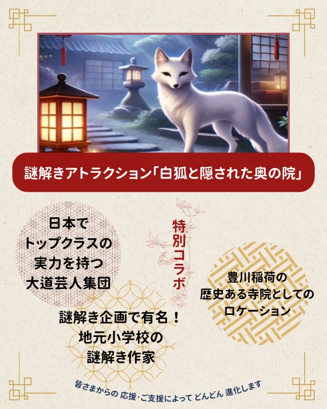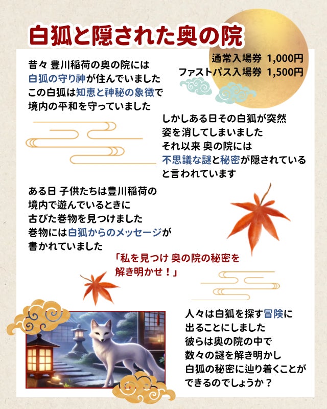私たちはこの「謎解きアトラクション」を日本三大稲荷・豊川稲荷にて行うため準備しています。