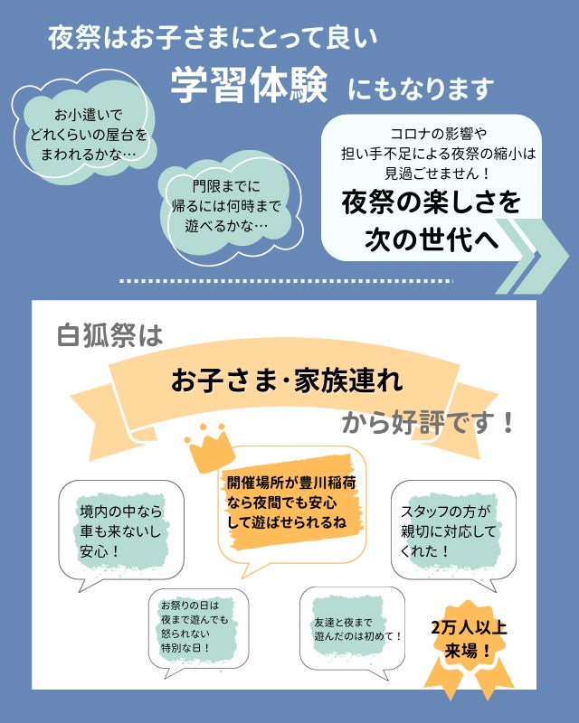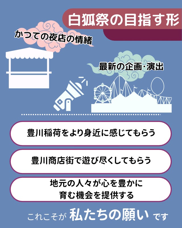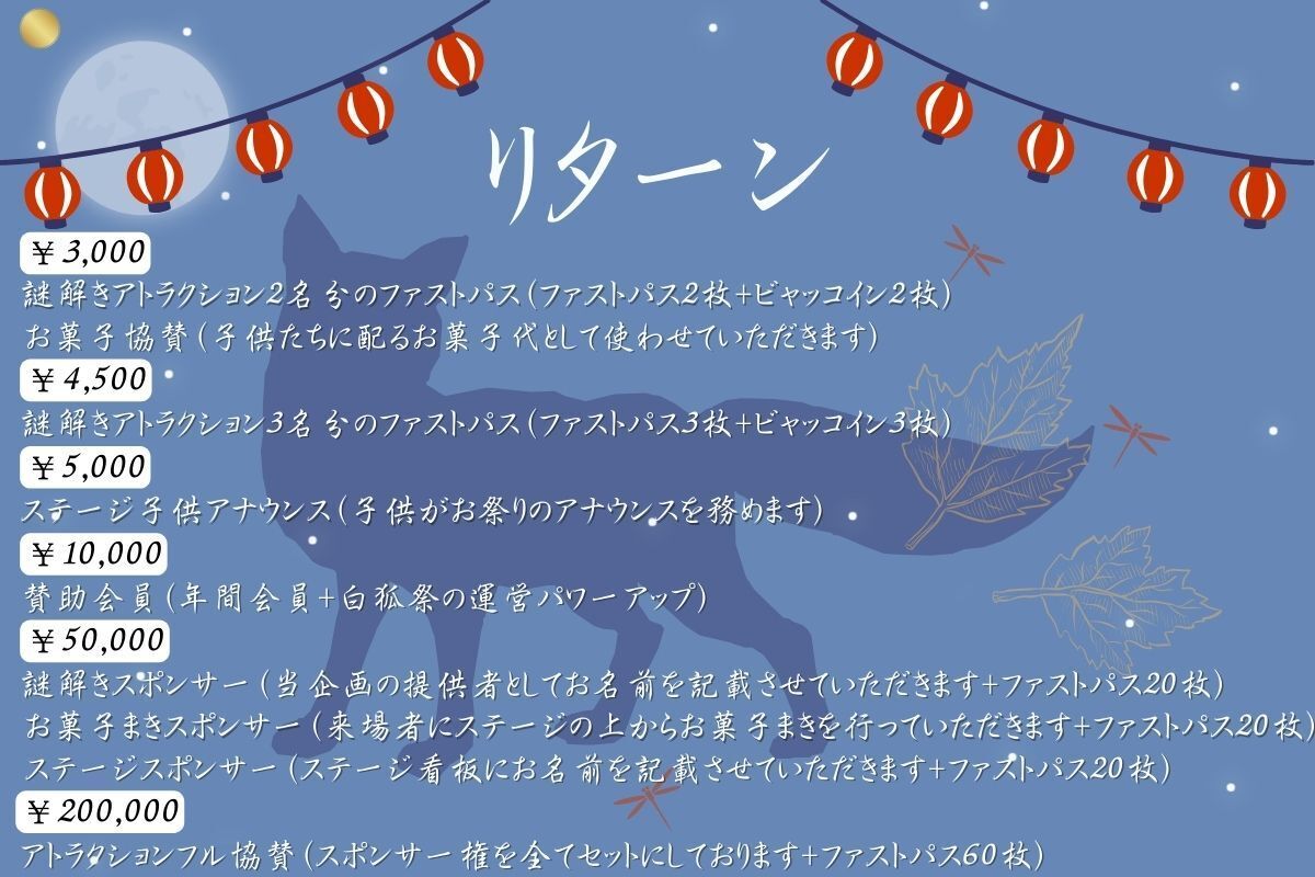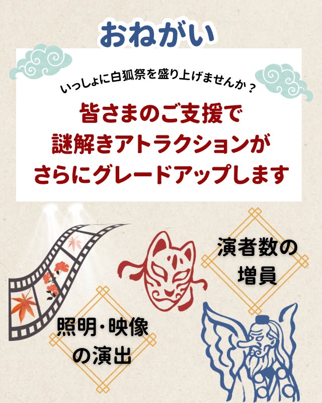 皆様からご支援いただいた資金は、白狐祭を守り、今後更なる企画や挑戦のための資金とさせていただきます。夜店やライトアップの装飾・演出、子供たちへのイベントや体験の提供などに活用していく予定です。また、最新のテクノロジーを用いて楽しい仕掛けを取り入れることで、より一層の驚きと喜びを提供していきます。