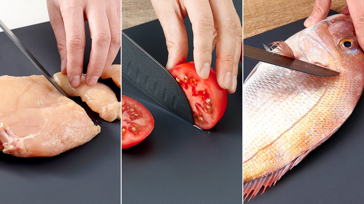木製のまな板のようなやわらかな刃あたりで、食材がすべりにくく刃がしっかりと入り込むので、お肉やお魚、カボチャなどの硬い食材もしっかり楽に切ることができます。