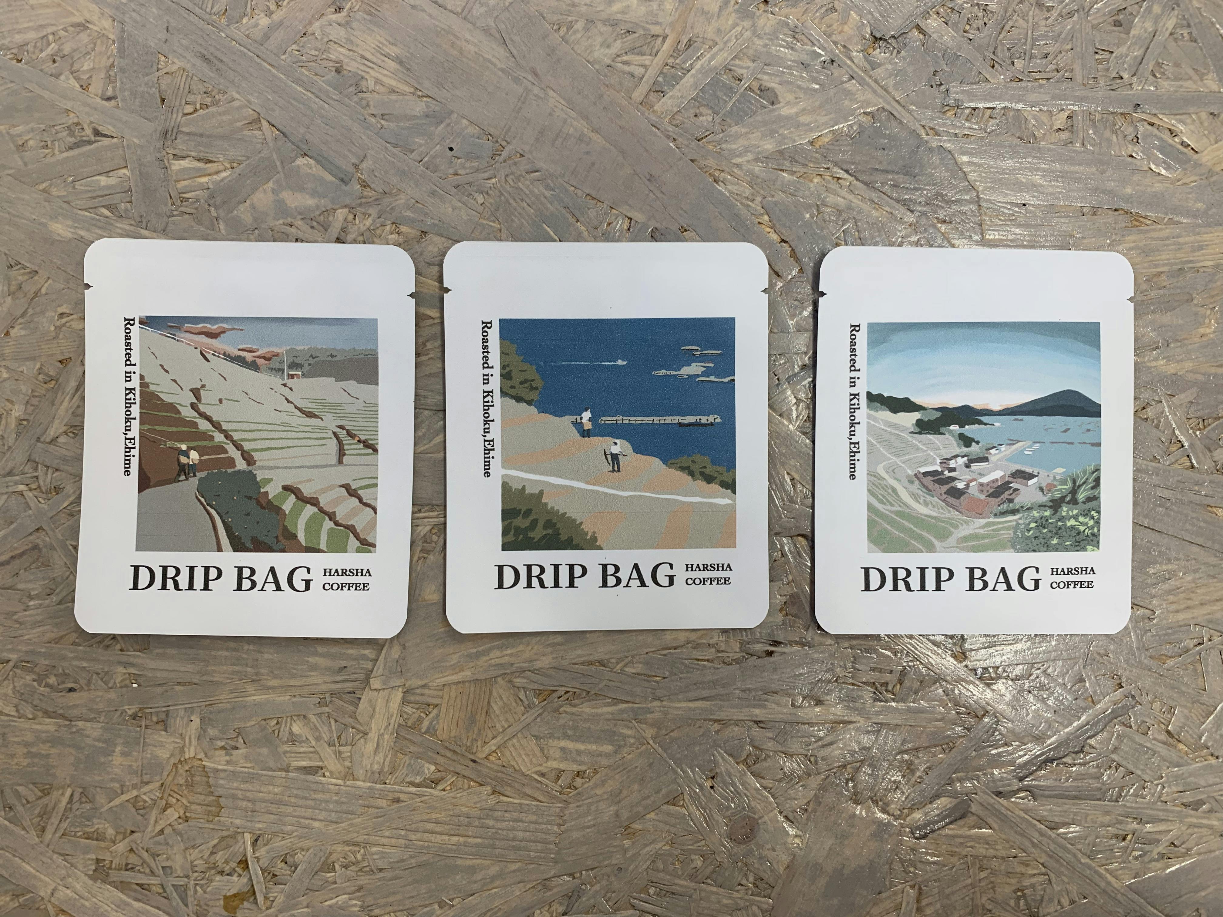 ドリップバッグに描かれているイラストは、朝・昼・夕方の3シーン。どれも再現性が高いイラストで、HARSHA COFFEEロゴでお馴染みの有機さんが描いています。
