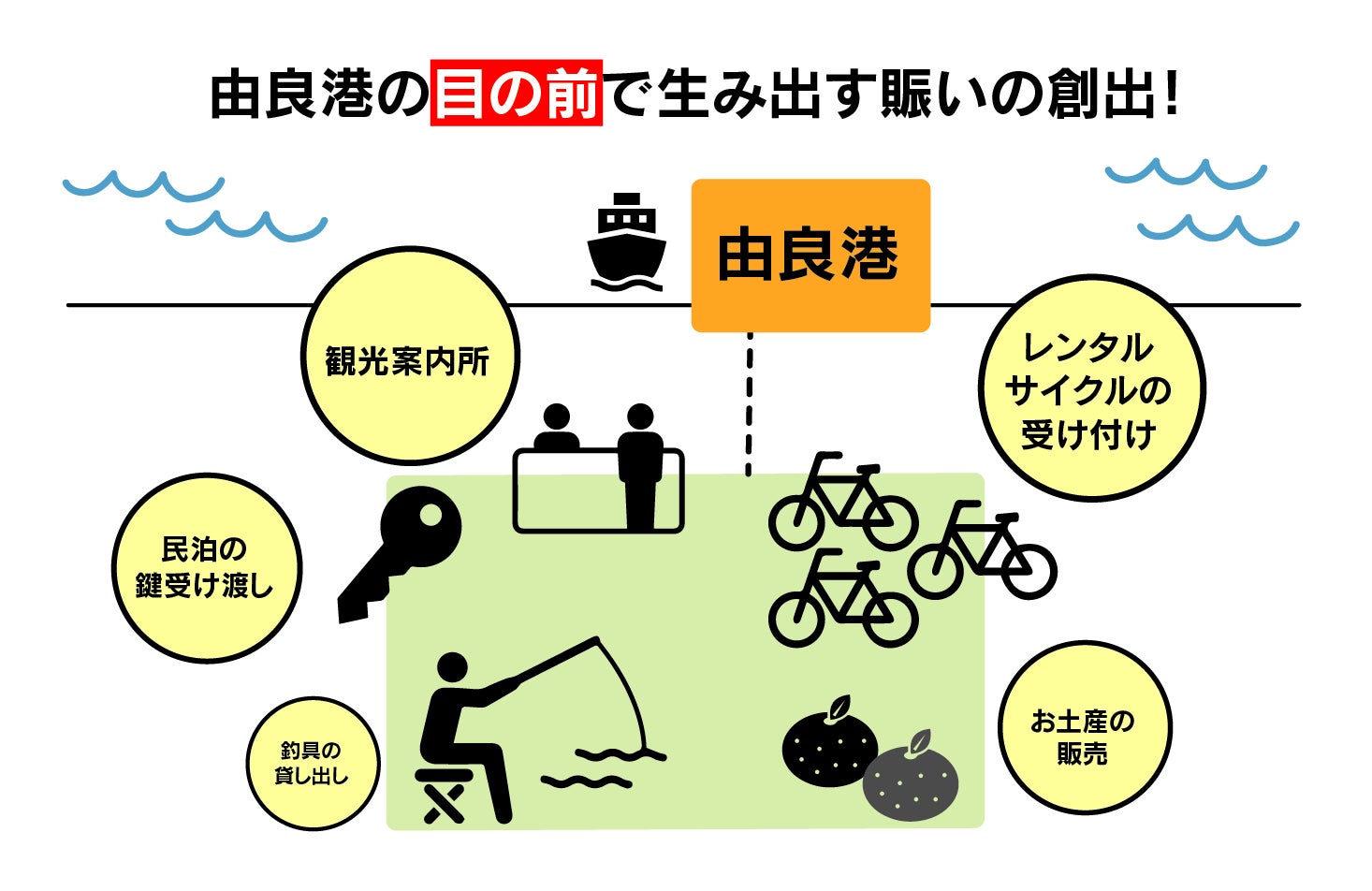 今回のプロジェクトでは、興居島の玄関口である由良港の目の前に総合観光施設をオープンすることを目指します。