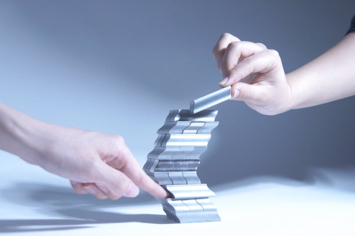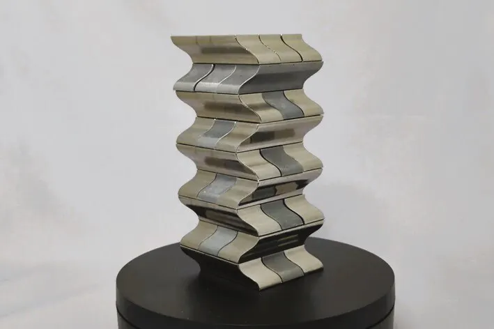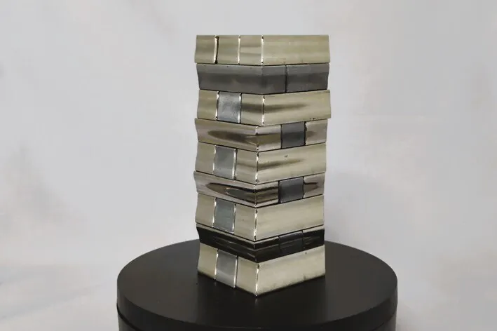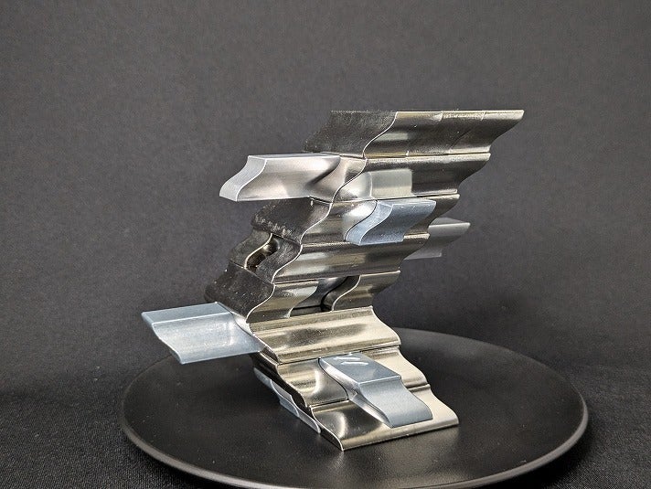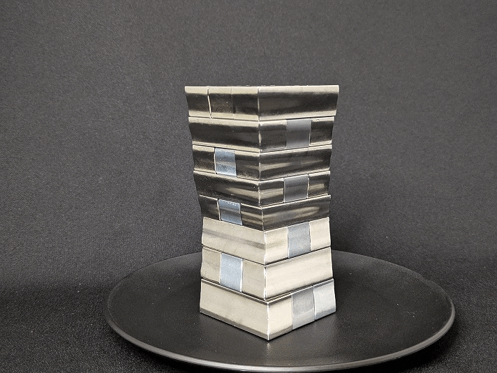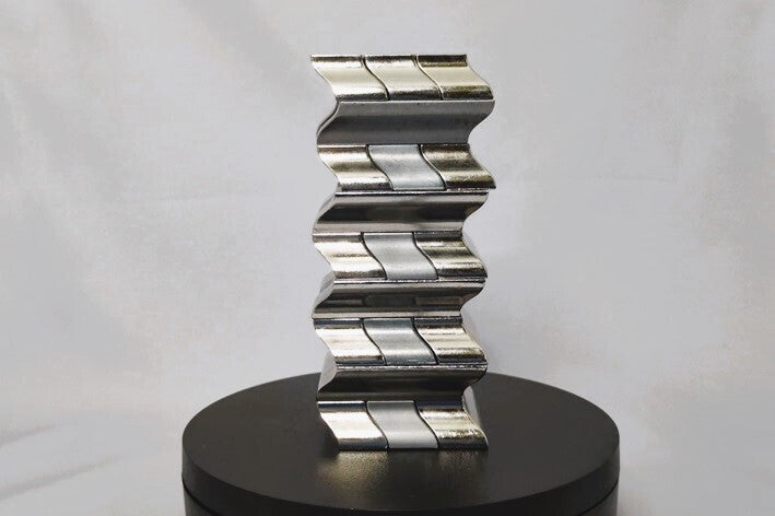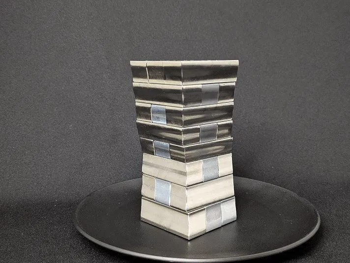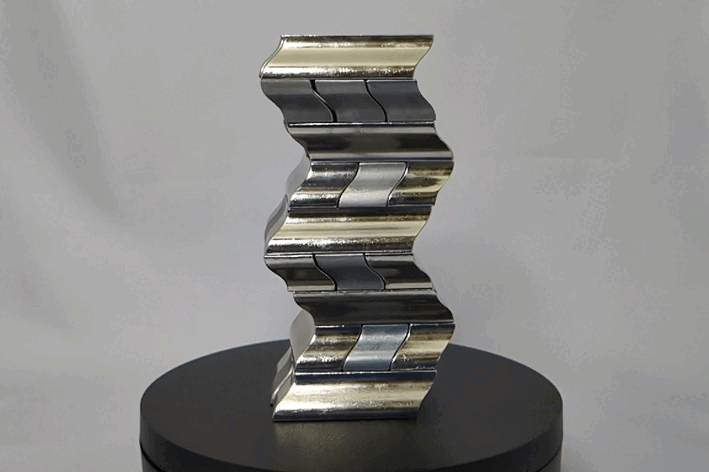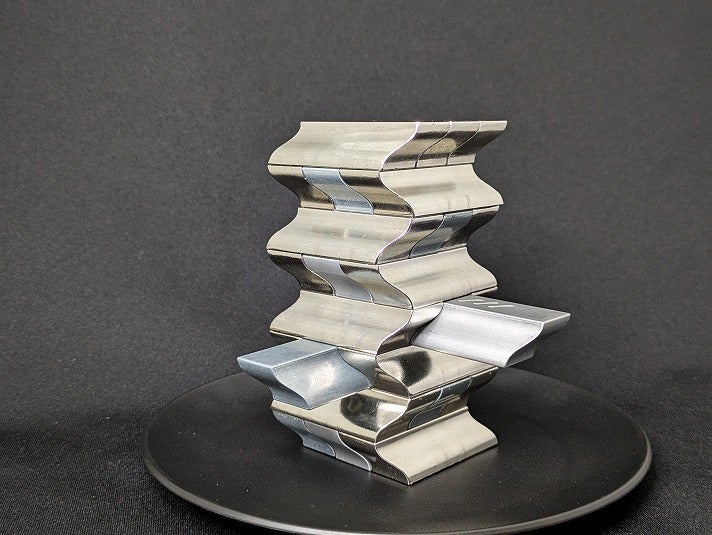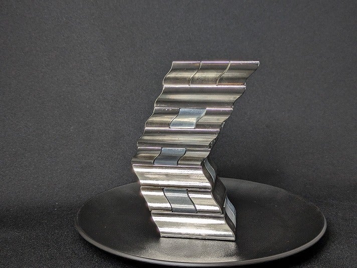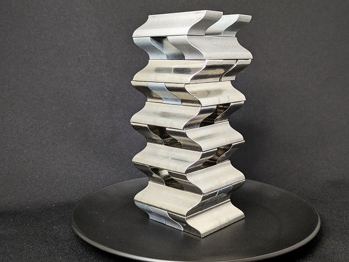 A:メッキ品は当然錆に強いですが、アルミ合金の素地のものはやや錆びます。濡れた手で触ったり、湿気の多いところには置かないでください。錆びると白錆と呼ばれ、白い粉がふいたようになります。もし錆びた場合は、紙やすりなどで簡単に除去できます。そしてこれを防ぐために、通常のものはピカピカにメッキをしてあります。今回はメッキあり・なしを混ぜることで、作品としての見栄えを出す演出としています。