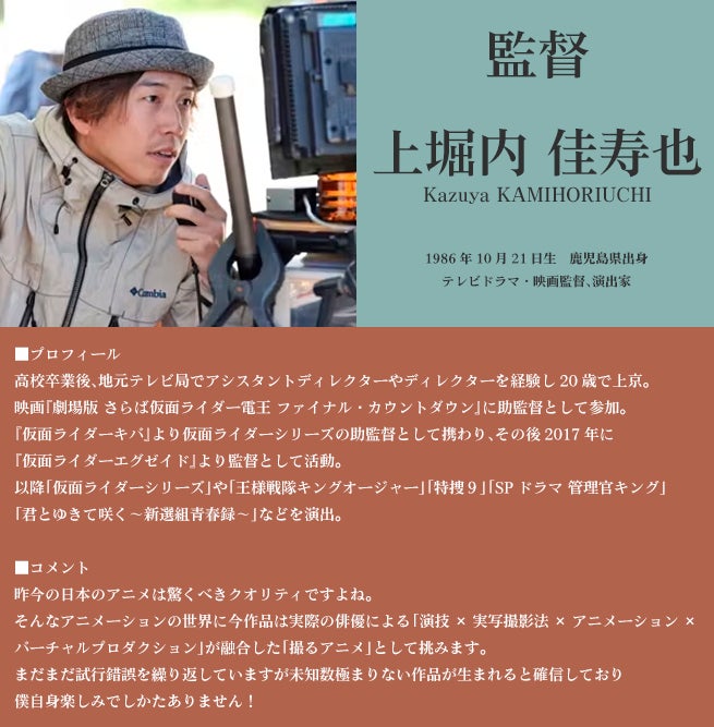 こうした思いのもと本作の監督をお願いしたのは、弊社が昨年一年間『王様戦隊キングオージャー』のバーチャルプロダクション撮影をご一緒させていただき、その才能と映像にかける熱意を目の当たりにして将来日本を代表する映像作家になると確信するに至った上堀内佳寿也監督です。