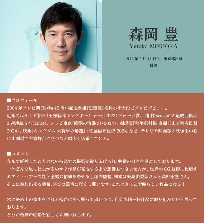 また今回の斬新な映像を実現するに当たり、普通の撮影手法とはかけ離れた大変難しい演技が要求されるため、『王様戦隊キングオージャー』で一年間にわたる上堀内監督との共同作業を経験している森岡豊様と長谷川かすみ様のお二人に出演をお願いし、ご快諾いただきました。