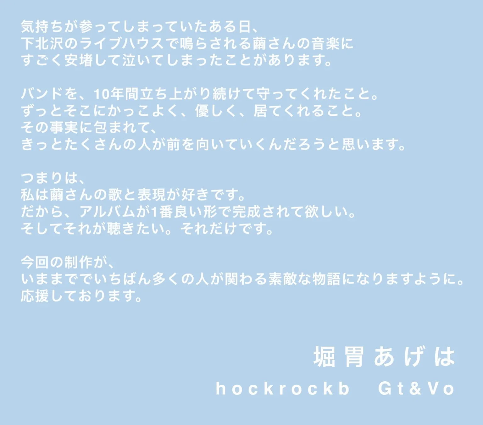 そしてこのクラウドファンディングを通して、新しくわたしたちの音楽に触れてくださるみなさんと少しでも多く出逢えたらうれしいです!