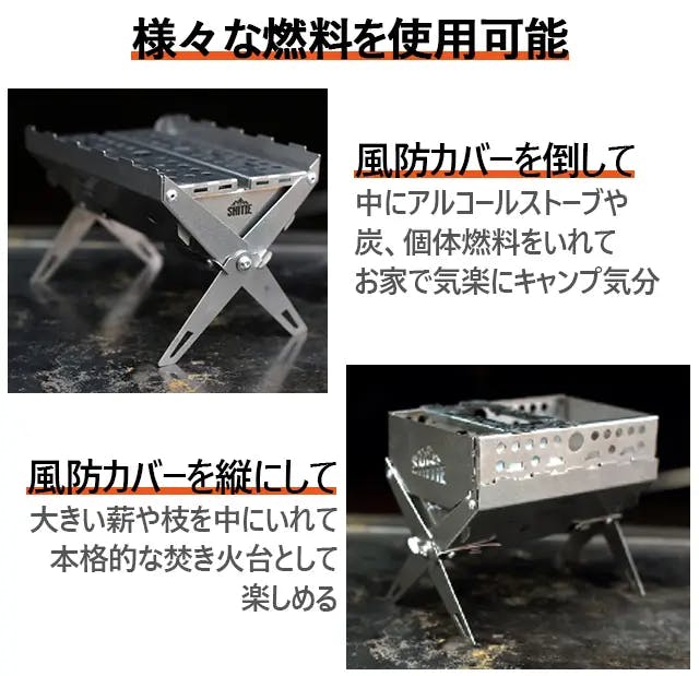 現地で調達できる枝や枯葉を燃料に、お湯を沸かしたり、肉を焼いたり、暖を取ることに加え、撤収も容易なため、アウトドアの現場で活躍します。