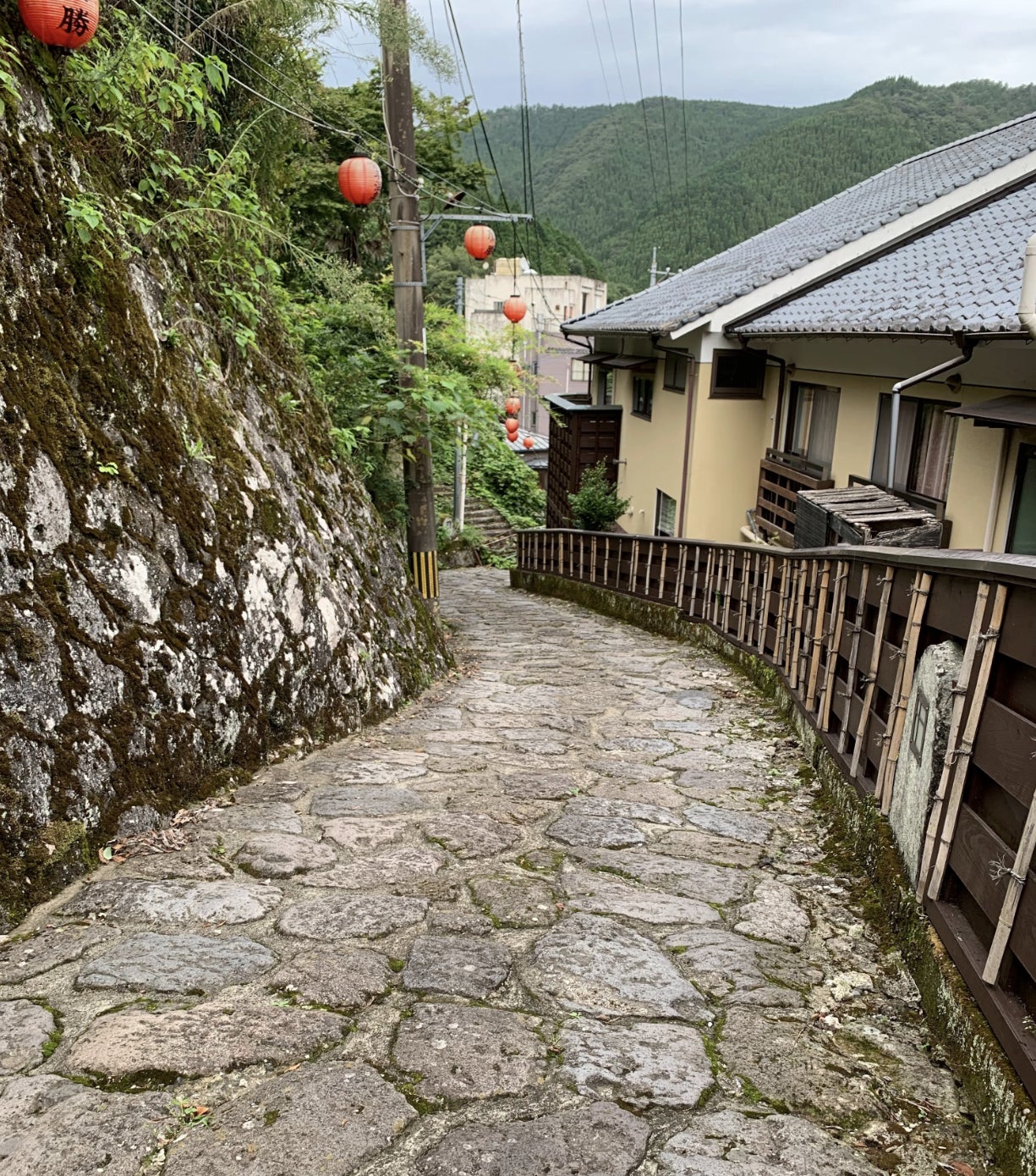 300年の時を超えて、復興のシンボルでもある石畳。ひとつひとつ形や色が違い、温泉街に野趣あふれる小道を作っている。