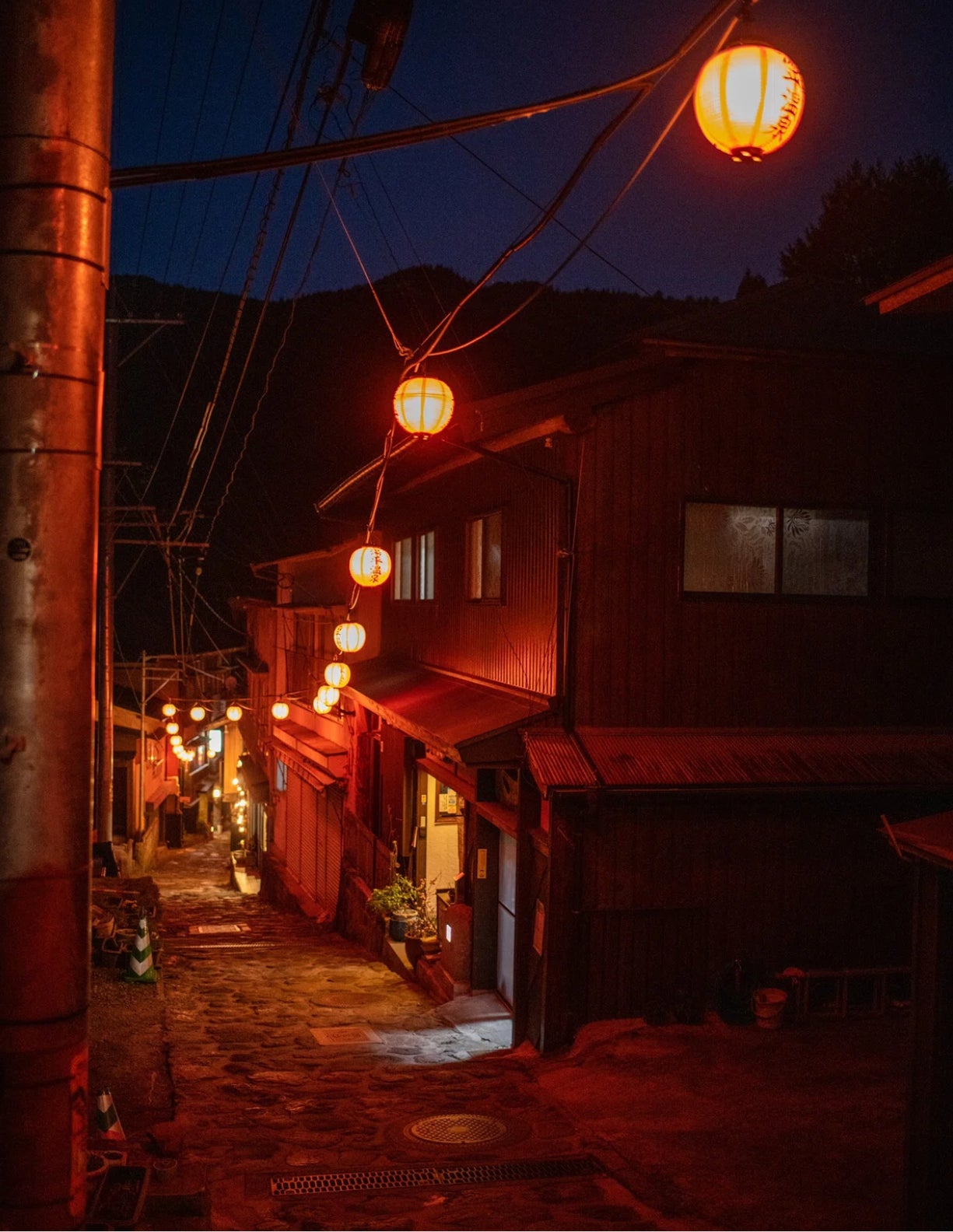 10数軒の旅館が石畳や小道に張り付くように立ち並び、赤提灯に照らされ情緒のある湯平温泉街。
