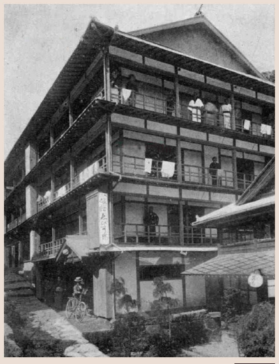 石畳の横に立つ木造4階建ての旅館。各階に浴衣を着た湯治客がみえる。当時は、石畳がみえなくなるくらい多くの湯治客でにぎわっていた、という。(写真アーカイブ湯平温泉観光協会HPより)