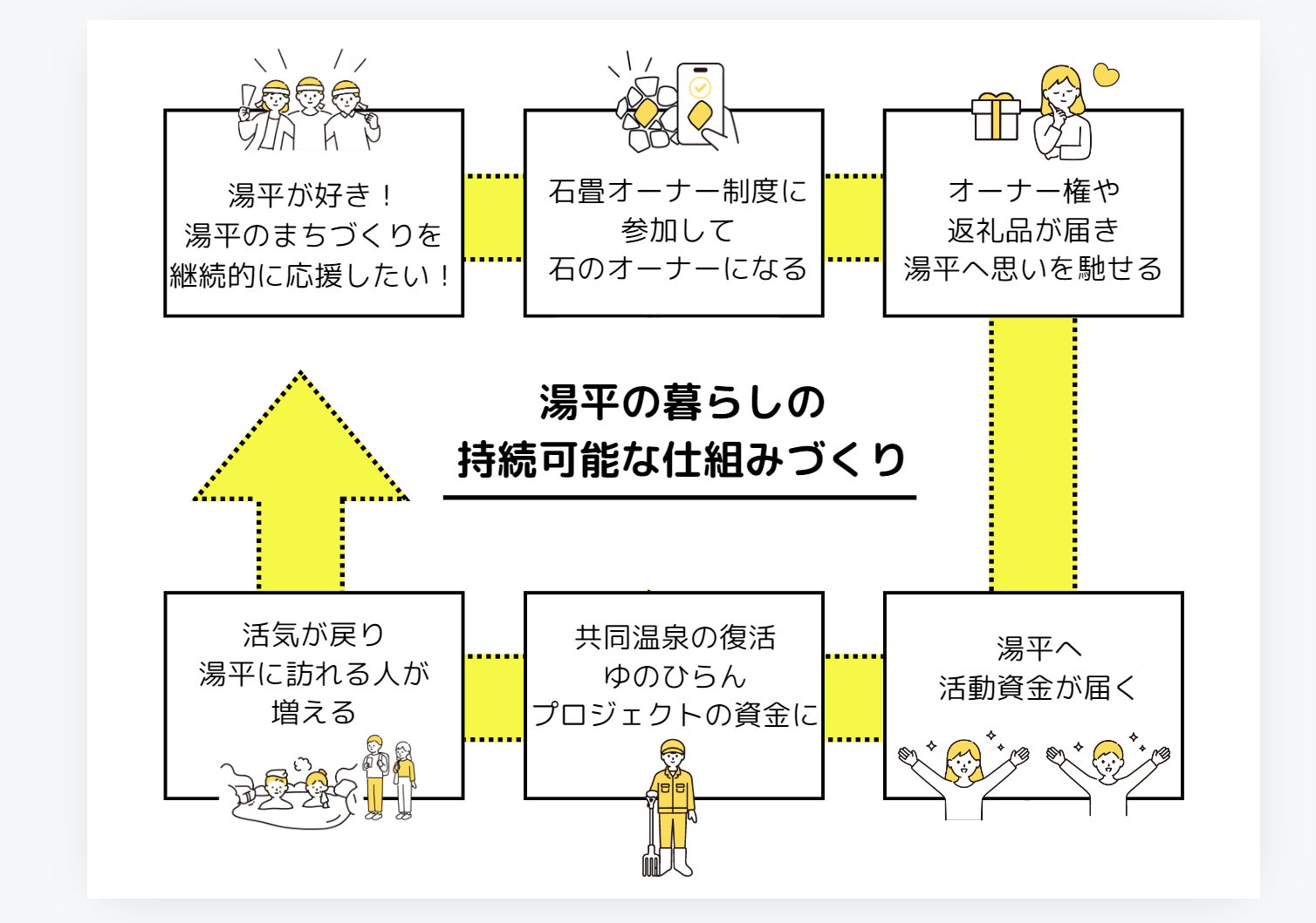 石畳のオーナー希望の方には、石畳のオーナーシップ(石畳のオーナー権)を発行し、リターン(地域の特産品や、温泉入浴券、湯平に訪れた際の特別プログラムなど)をお届けできる仕組みを考えています。
