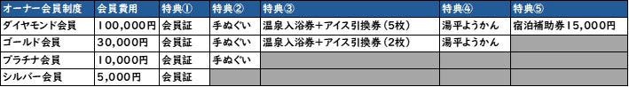 オーナー制度の会員ランクは、ダイヤモンド会員(100,000円)、ゴールド会員(30,000円)、プラチナ会員(10,000円)、シルバー会員(5,000円)を考えています。