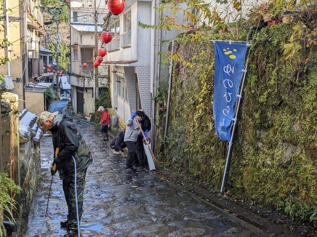 先日、ゆのひらんプロジェクトの活動の1つである「グリーンクリーンプロジェクト」の一環で、石畳の清掃活動を行いました。