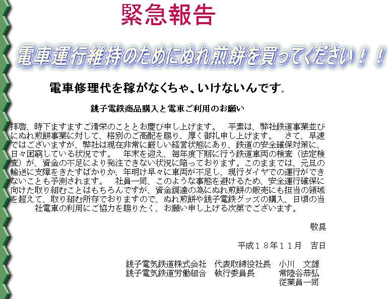 弊社公式サイトにこの一文が掲載されるや否や、全国から銚電オンラインショップに15,000件もの注文が殺到し、これを契機として運行維持への弾みがつき、奇跡的に倒産の危機を回避することができたのでした。