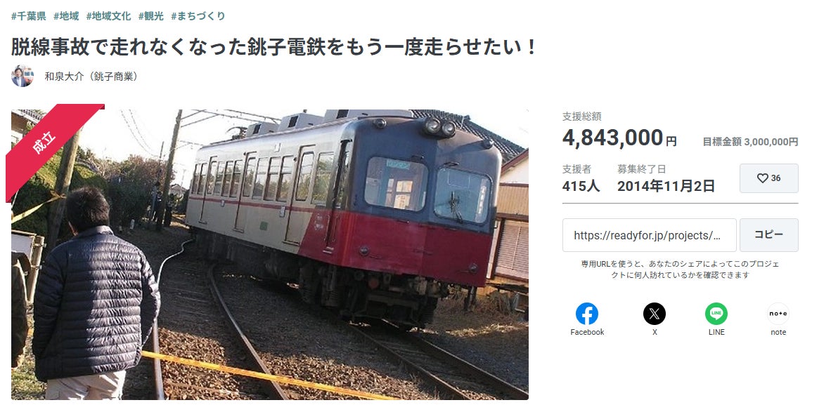 2025/01/15 19:00こんにちは、銚子電鉄クラウドファンディング事務局です!クラウドファンディングも本日が最終日、残り数時間で終了となってしまいました。開始から1ヶ月半、おかげさまでたくさんの方々に応援・ご支援をいただきました。先日には目標金額の1000万円を達成することができ、それだけでなく更に多くの追加ご支援も頂戴しております。最後の最後まで応援をいただいた皆様へ、社員一同、心より感謝申し上げます。…銚子電鉄は「日本一のエンタメ鉄道」として、日頃から皆さまに楽しんでもらえるよう心がけております。また、ぬれ煎餅をはじめとした食品の製造も行っていたりと、鉄道とは一見関係のないところでも広く取り組みを進めています。しかし、全ては銚子電鉄の鉄路を守るため、鉄道の灯火を絶やさぬようにするため。鉄道は「装置産業」と呼ばれ、線路の維持や車両メンテナンス、電車の運行のための乗務員確保など、たとえ利用者がいなくとも多額の費用ががかかります。また、ご存知の通り、全国のローカル鉄道を取り巻く環境は、更に全国的な少子高齢化、人口減少の影響を大きく受けて年々厳しくなっています。とはいえ、鉄道を必要としていただける地元の方々がいる限り、その歩みを止めるわけにはいかないのです。かつての社長自身による横領事件、脱線による廃線の危機…多くの困難があった中で、助けていただいたのは、まぎれもなく「絶対に廃線させない!」という社員の強い思いと、それに共感してくださった皆さまのご支援によるものです。そして今回も、新車両を「観光列車化」するという無謀にも思える挑戦でしたが、クラウドファンディングがスタートすると実際にたくさんの皆様にお力をお借りすることになりました。多くの方々へ苦しい現状を汲み取っていただき、私たちだけでは成し得なかったであろう「観光列車化」という大きな目標がいよいよ現実味を帯びてきました。ここまでご協力いただいた皆様には重ねてお礼を申し上げます、本当にありがとうござます。クラウドファンディングを通して頂戴するたくさんのメッセージ、暖かいお言葉に社員一同が心打たれております。このご恩を返すべく、どうか今回のプロジェクトを成功させたい。見事新車両がデビューできたあかつきには、銚子へお越しになるお客様、そして地域の皆様への恩返しができるのではないかと心底思っております。「次の100年も走り続けること。」これが私どもの願いであり、使命であります。…いよいよ残りわずか、皆様とともに最高のエンディングを迎えたい!私どもからのお願いばかりで恐縮ではありますが…どうか最後の最後まで、何卒よろしくお願いいたします。 もっと見る