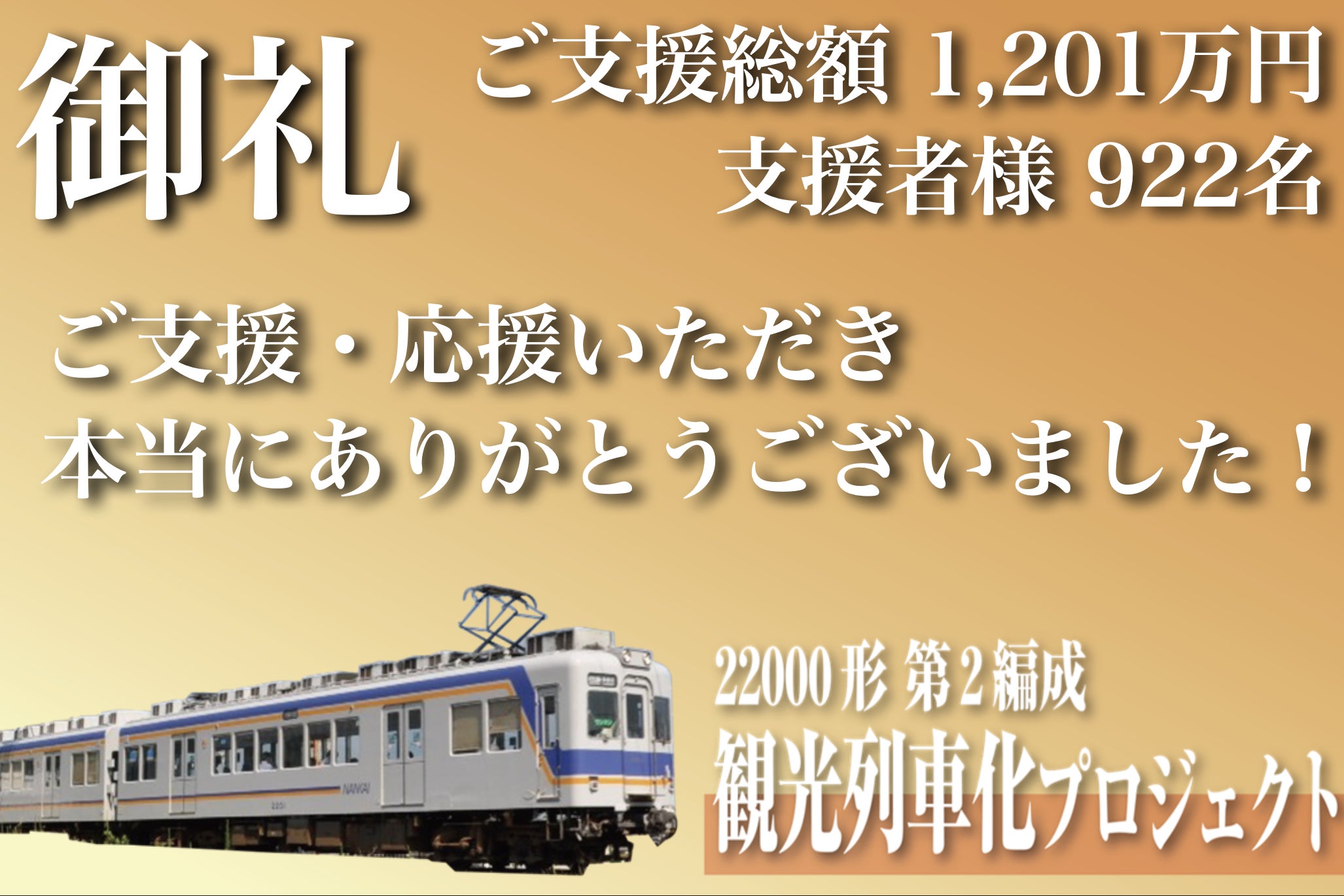 2025/01/16 14:00こんにちは、銚子電鉄クラウドファンディング事務局です!昨年12月より45日間実施していました「22000形 第2編成の観光改造化に向けたクラウドファンディング」が、昨日無事終了いたしました。最終的におかげさまで目標額の1000万円を上回る、約1200万円の支援金額と支援者様は922名となりました。この度、応援してくださった全ての皆様に社員一同、改めて感謝申し上げます。本当に、本当にありがとうございました。1000万円という大きな目標ではありましたが、目標達成だけではなくまさか200万円も上回ることができるとは思いもしませんでした。みなさまからのメッセージについても1通1通ありがたく拝読しております。ここで、弊社代表・竹本より、皆さまへ感謝の言葉を動画にて伝えさせていただきます。 〜〜〜〜〜銚子電鉄代表の竹本でございます。この度は、弊社の22000形 第2編成 観光改造化クラウドファンディングにお力添え賜り、誠にありがとうございます。おかげさまで目標額の1000万円を上回ることができ、感謝の思いは尽きません。現在、観光改造に向けて工事は順調に進んでおります。完成の暁には、ぜひ銚子にお越しいただき、銚子観光を楽しんでいただければ幸いでございます。応援してくださる全ての皆様に改めて感謝申し上げます。本当に有難う御座います。〜〜〜〜〜最初は、新車両を「観光列車化」するという無謀にも思える挑戦でしたが、みなさまのおかげで大きな目標が見えてまいりました。今後は、観光改造工事を進めてまいり、近いうちに皆様へお披露目できますよう邁進してまいります。その時まで今しばらくお待ちくださいませ。ご支援に対するリターンの返送についても、集約出来しだい順次開始してまいります。到着まで今しばらくお待ちください。…最後になりますが、ローカル鉄道を取り巻く環境は以前厳しい現状が続きます。今回のプロジェクト達成はそんな状況に共感してくださり、救いの手を差し伸べてくださった皆さまのご支援によるものです。決して私たちだけでは達成できませんでした!この想いを無駄にすることなく、観光列車の完成そして新しい銚子観光の玄関口としてデビューできることで恩返しさせていただきたく思います。重ねてお礼申し上げます。本当にありがとうございました!銚子電鉄 社員一同 もっと見る