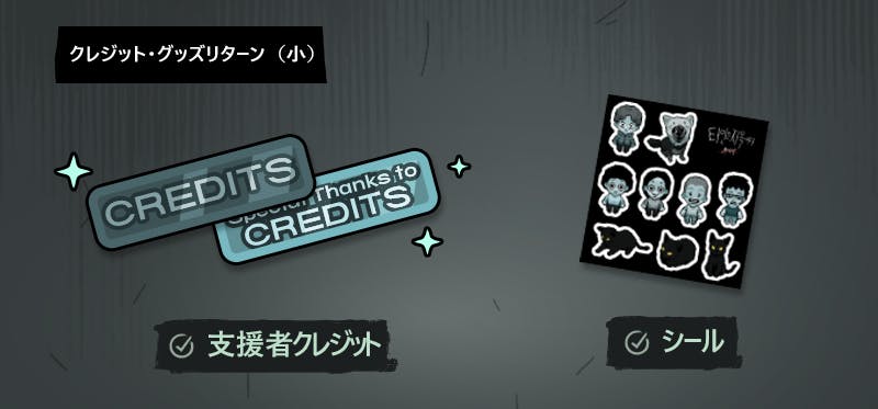 リターン:支援者クレジット / グッズ(小):シール /(基本提供)感謝メール / ゲーム/ アイテム / 壁紙 / 支援証明書