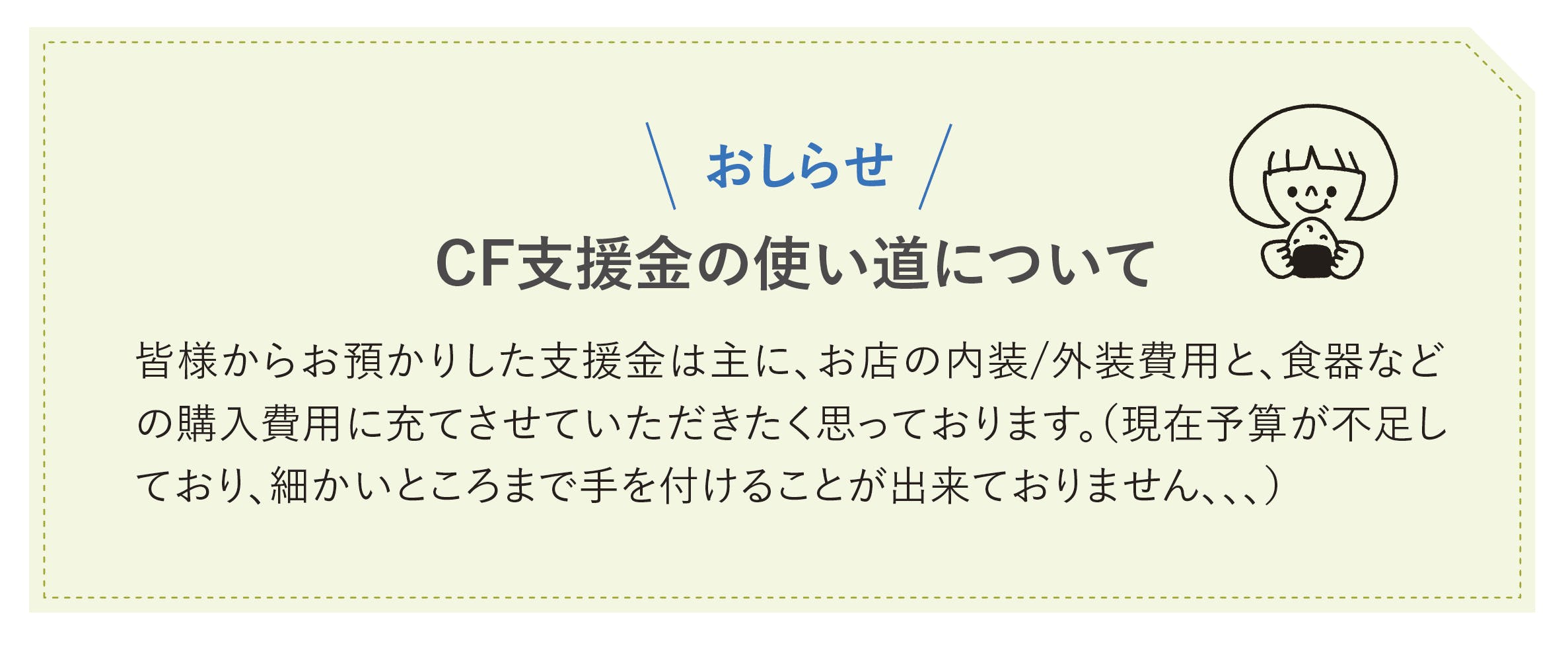 ※この部分に思いのほか費用がかかり、理想のイメージに届ける予算が足りておりません・・机もあるものを使い、キッチンまわりも現状維持のままとりあえずお店をOPENさせていただきました。スムーズな料理提供の為にもう少しキッチンを修正したいと考えております。ぜひ皆様のお力添えを頂戴したく思っております!