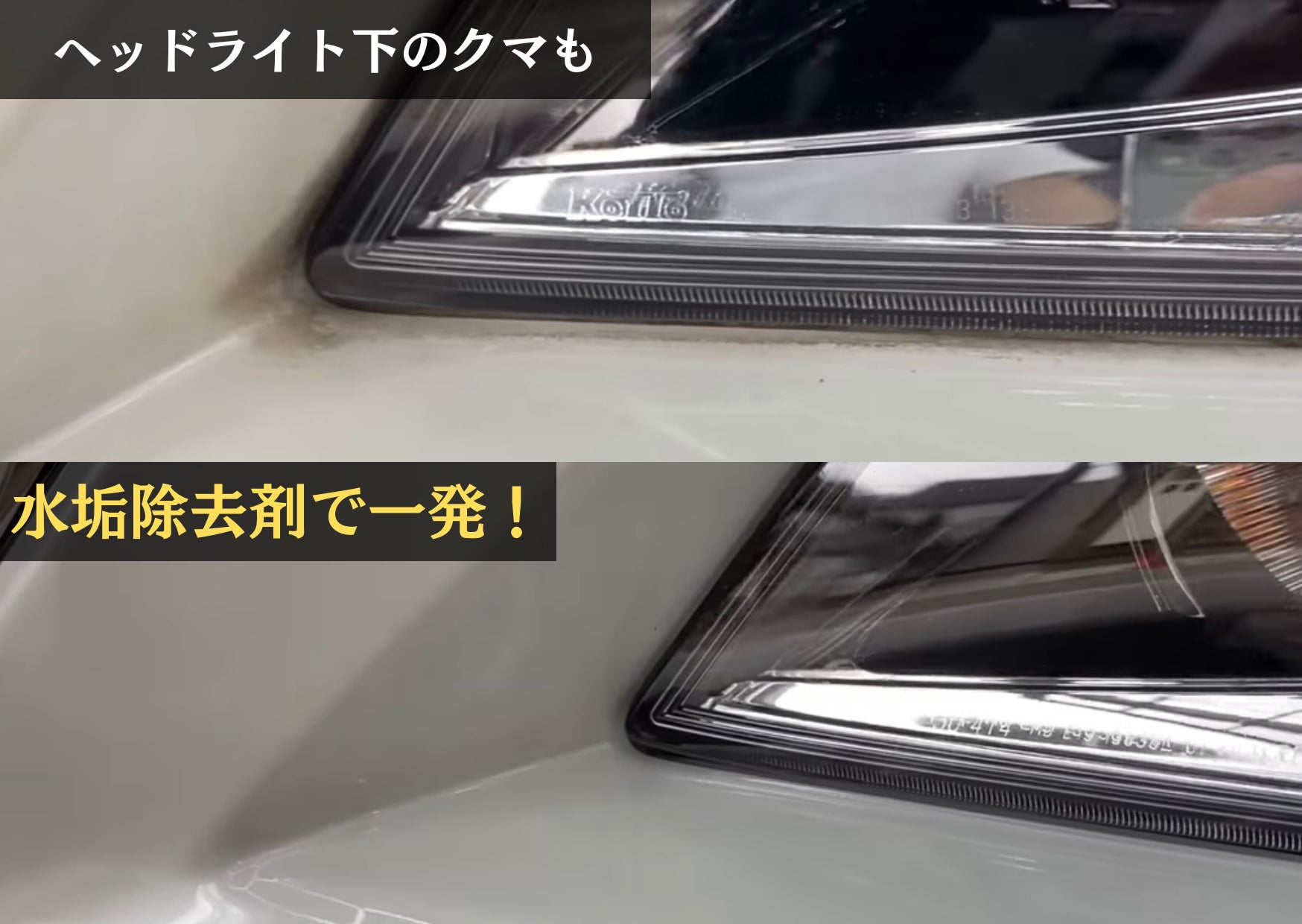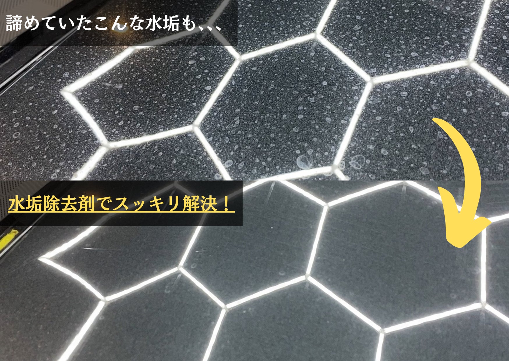 では、どうすれば良いのでしょうか?答えは、定期的に「スケール除去剤」を使ってメンテナンスを行うことです。毎回の洗車ではなく、月に1回、または3ヶ月に1回のペースでスケール除去剤を使用することで、洗車だけでは落としきれない水垢汚れを落とす事ができ、完全に汚れを除去する事ができるのです