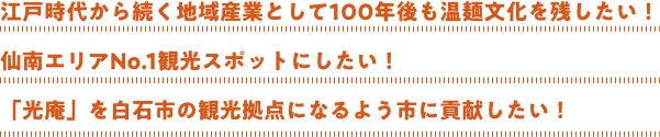 今後、「光庵」を核にして、次世代に白石温麺の文化を伝えることは、宮城県白石市で100年以上にわたって白石温麺の製造・販売を行ってきた私たちの使命だと思っております。