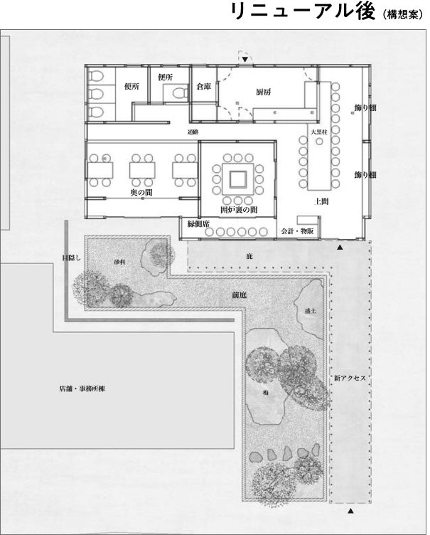 ①壁の撤去 ②梅の維持 ③松の移植 ④アクセス性の向上 ⑤庭のデザイン ⑥建物の視認性調整 など