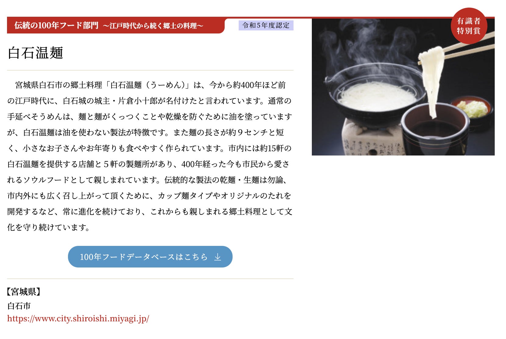 白石温麺は、文化庁が多様な食文化の継承・復興のために取り組む「100年フード」の中に令和5年度に認定された品として認定されています。