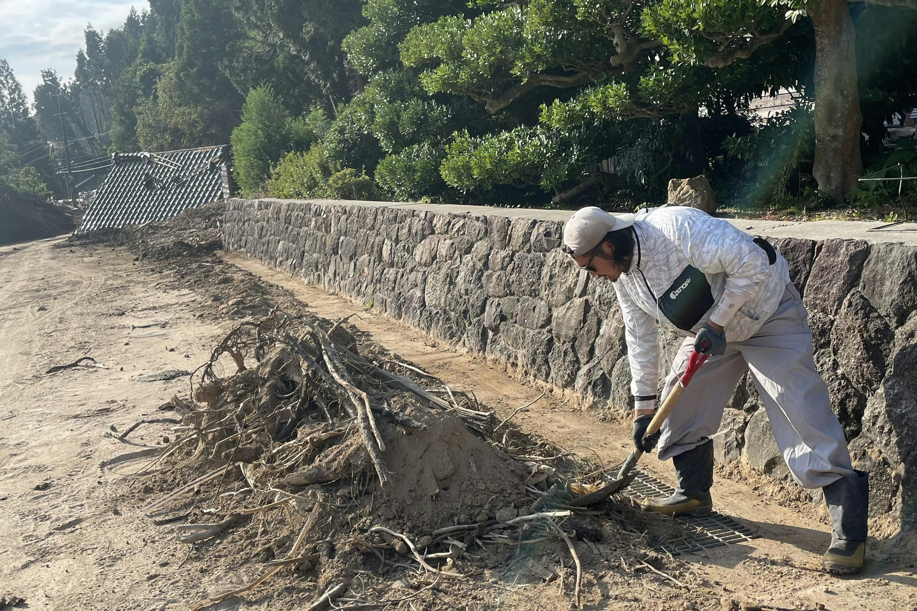 写真奥に見える車庫の前は車一台通れる分だけ流木や土砂をどかし、家の前の道路の両側の流木を集めました。この道の奥にも家があり重機が通りたいとの事でここも優先的に行いました。