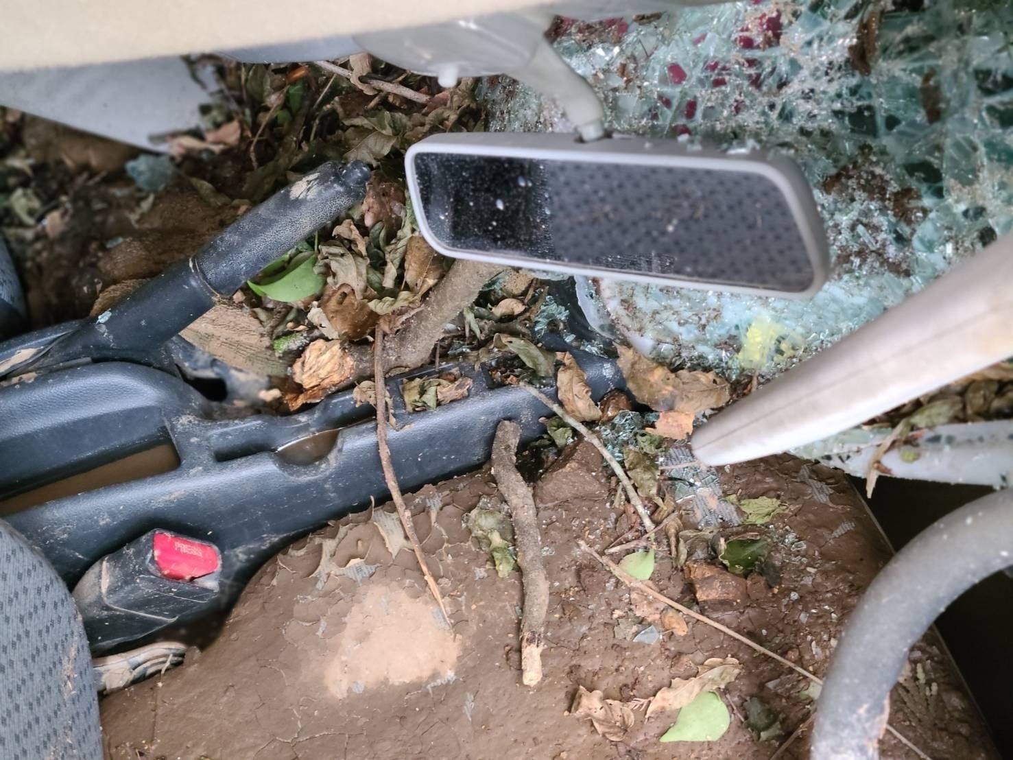 車は半分以上土砂に埋もれ、車体の上には流木が大量に覆い被さっていました。まず木などをチェーンソーで切って中が見える所まで辿り着きましたが、写真の窓の位置は地面と同じ高さにあり中の土砂も乾いて固くなっていて手作業で取り出すことは不可能でした。