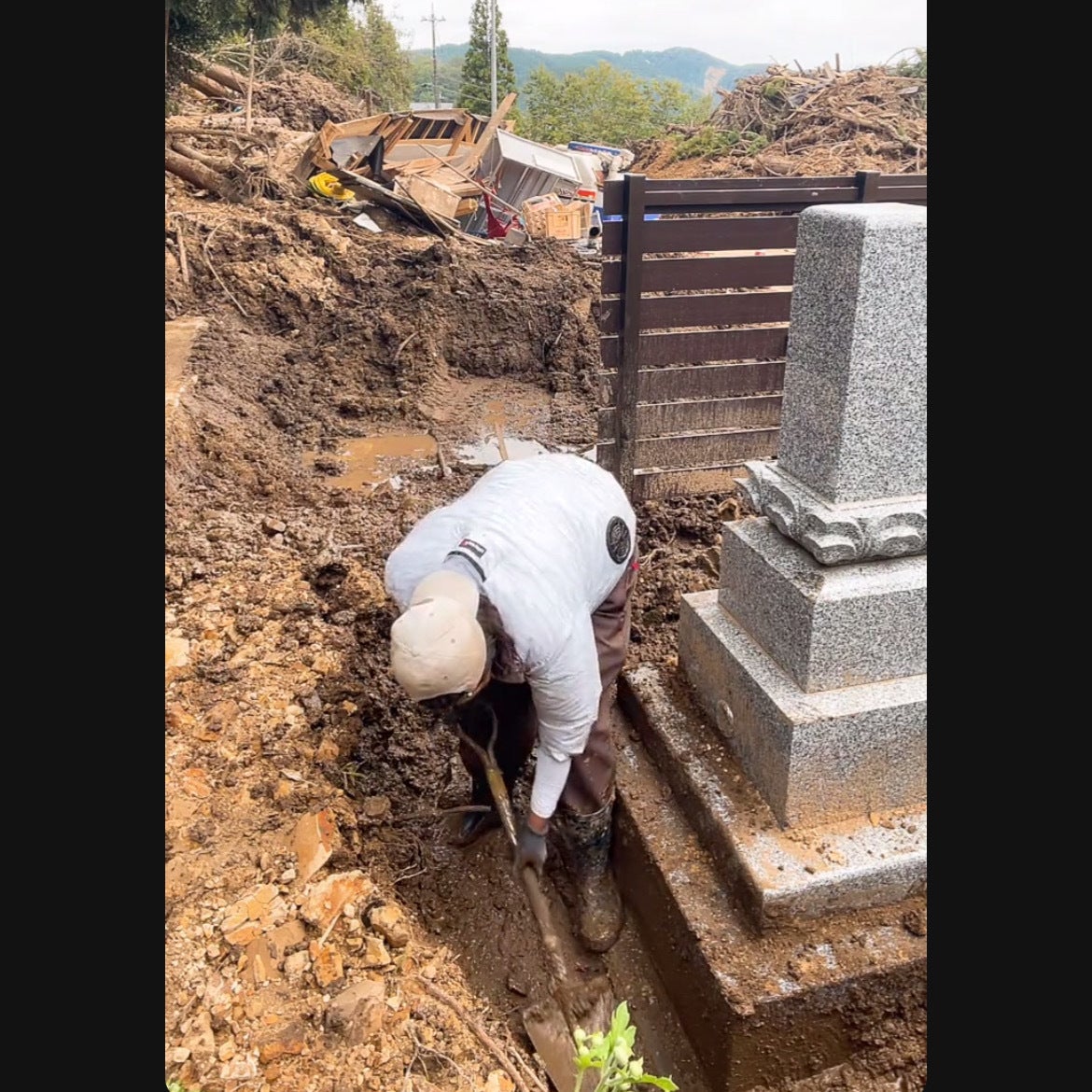 父と墓の周りの土砂をできるだけ取り出しました。土砂は50〜60cm程の高さでした。上部は乾いており硬くなっていたので、まず、つるはしで砕いてからスコップで掻き出す作業となりました。墓が設置してある箇所すべてとはいきませんでしたが当初に比べかなり土砂を取り出せたと思います。下の方は水が含んでおり硬い土より扱いやすかったですが、木の根っこや細かい木などが重い土の中で挟まっている所も多くスコップが差し込めず苦戦しました。Instagramの方で災害関連の投稿しているので復興作業など支援頂いた方々に宜しければ見て頂きたいので検索アカウント載せておきます。写真や動画も複数掲載できるので、より伝わりやすいと思いますので宜しくお願い致します。@hana_ttt87