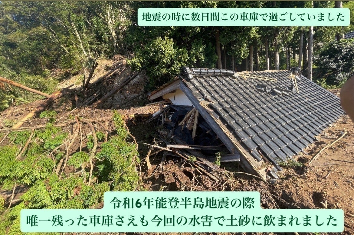 令和6年能登半島地震後に唯一残った車庫と稲刈り直前だった稲、農機具が今回の能登半島豪雨により甚大な被害を受け、全て奪われました。