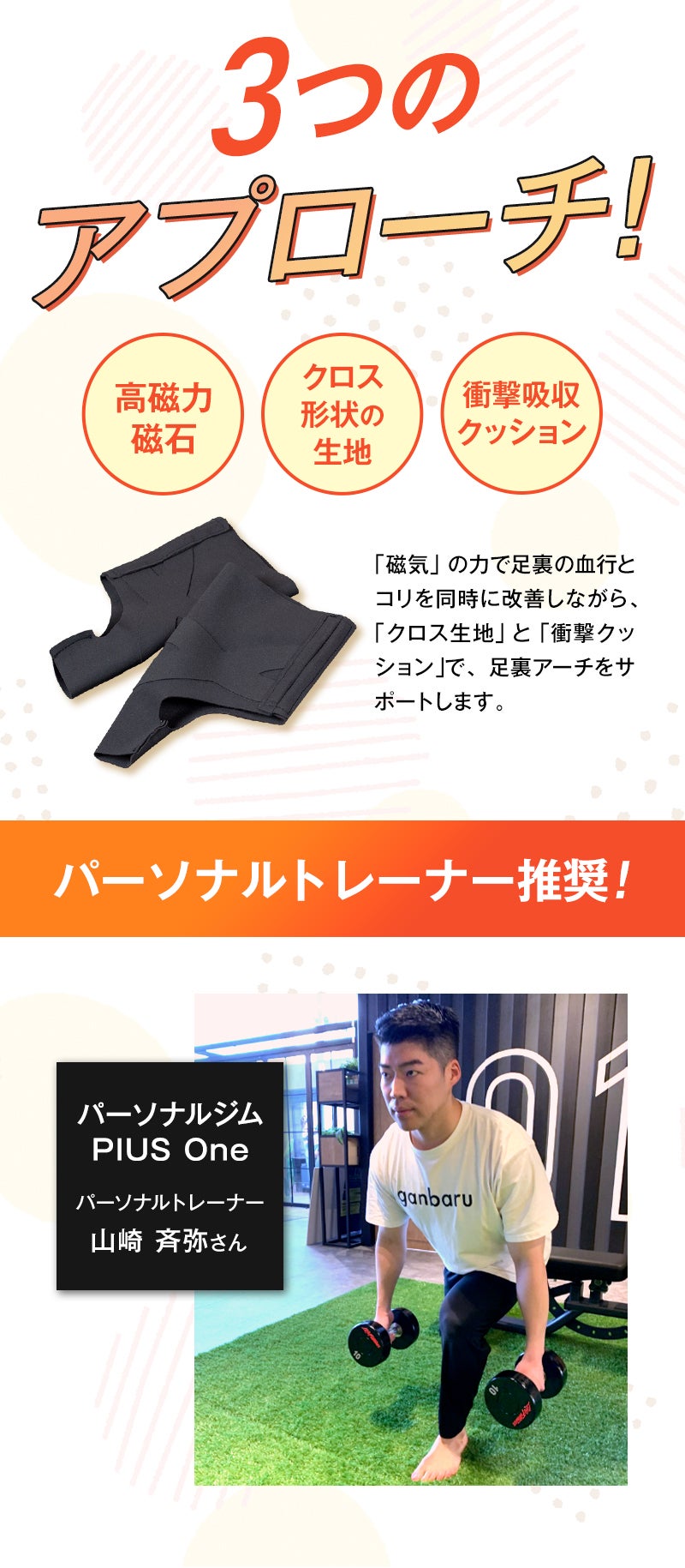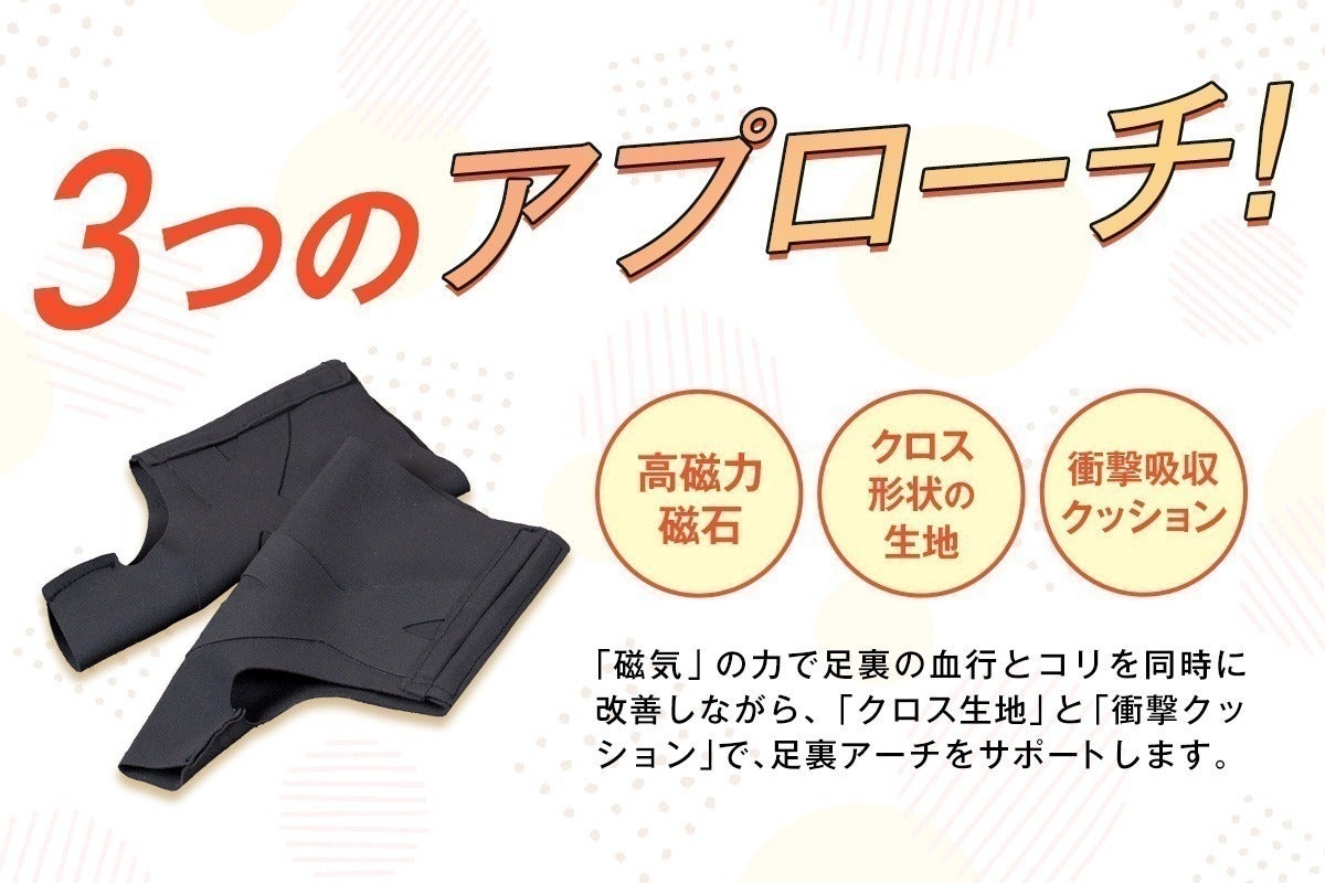 高磁力磁石・クロス形状の生地・衝撃吸収のクッションの3つのアプローチで足裏アーチをサポートします。