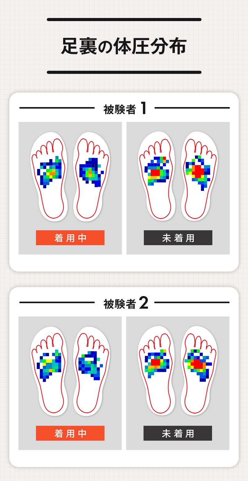 同じく土踏まず部分に圧がかかっています。しかし「STYLE ARTIST JIKI」を着用することで、足裏のバランスが良くなり、安定して歩行できるようになりました。
