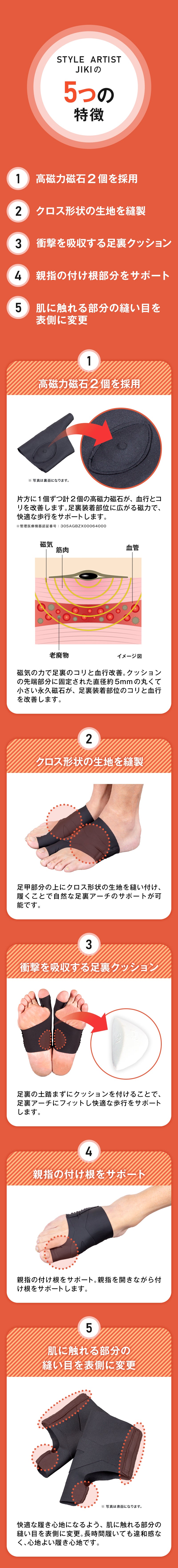- ズレずに快適なデザイン!高磁力磁石と薄くて通気性の良い素材で歩行中もしっかり足裏アーチをサポート!