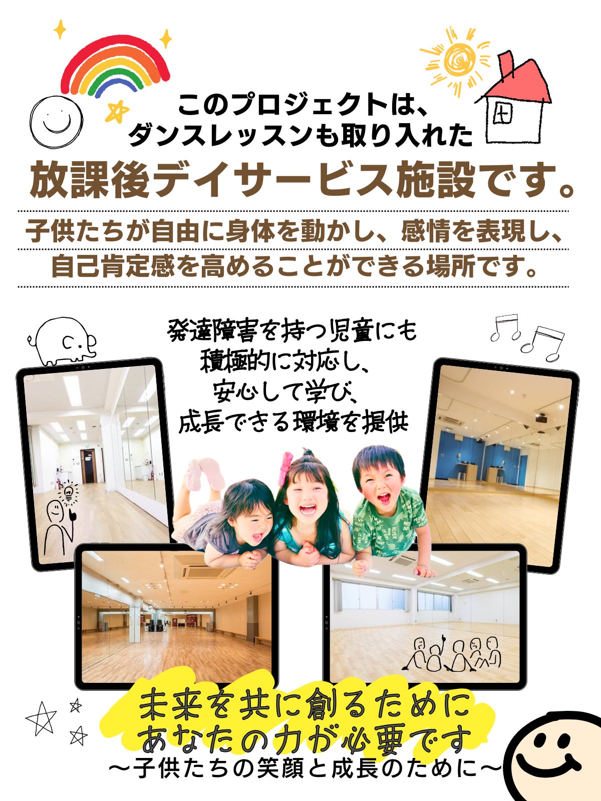 私たちが目指しているのは、単なる「ダンス教室」ではありません。ここでは、子供たちが自由に身体を動かし、感情を表現し、自己肯定感を高めることができる場所を作りたいのです。また、発達障害を抱える子供たちが安心して参加できるための支援体制も整え、彼らの個々のニーズに寄り添った指導を行います。既に施設は確保しているものの、デイサービスとしての機能を果たすために特定の設備や内装工事が必要です。